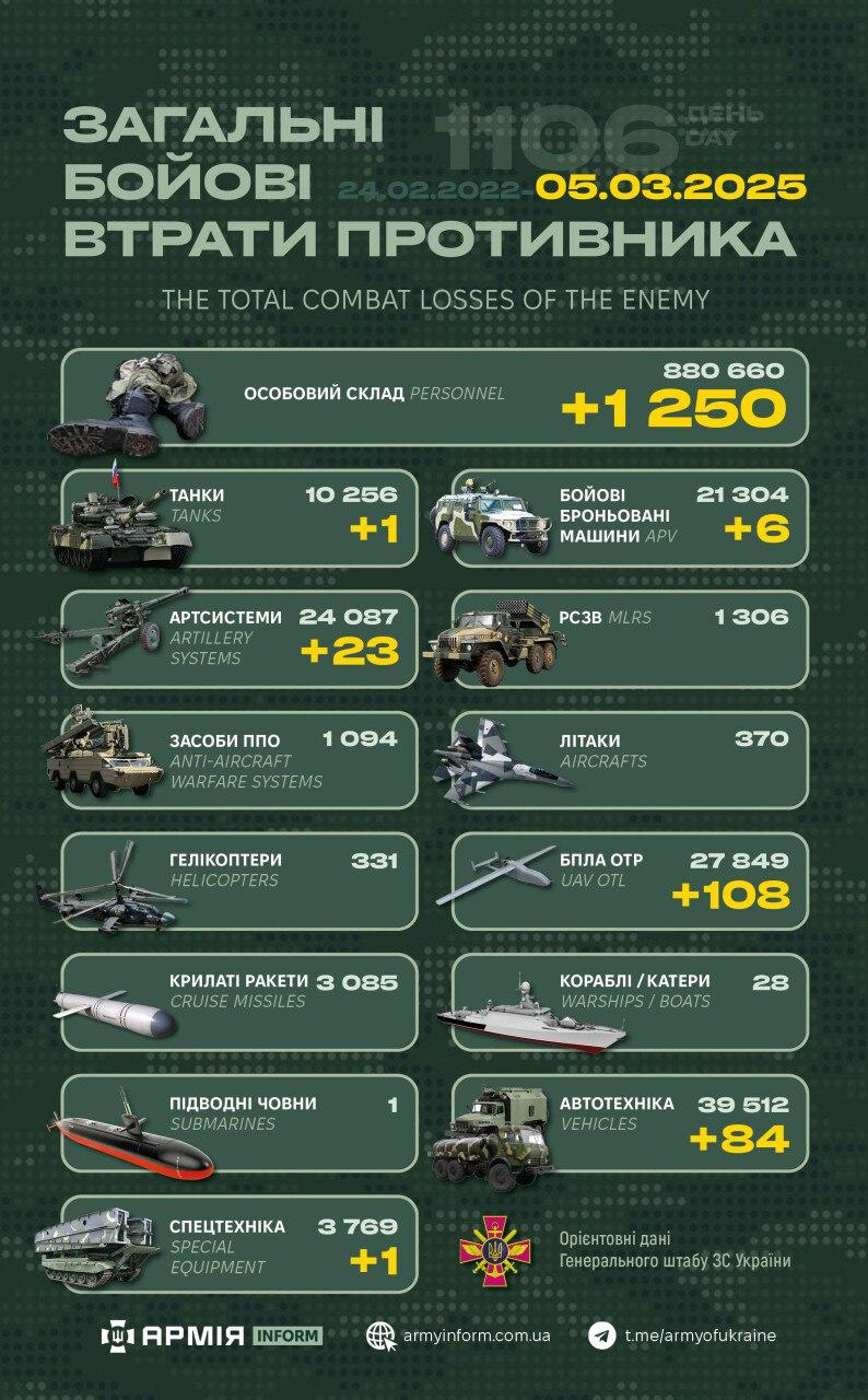 Загальні бойові втрати противника з 24.02.22 по 05.03.25 орієнтовно становлять: