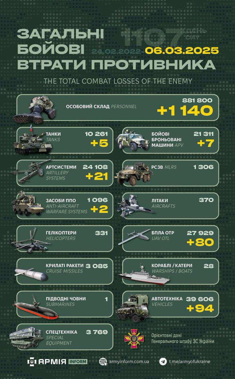 Загальні бойові втрати противника з 24.02.22 по 06.03.25 орієнтовно становлять: