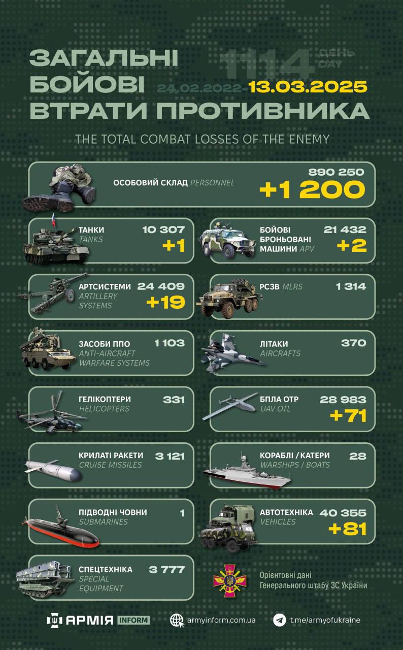 Загальні бойові втрати противника з 24.02.22 по 13.03.25 орієнтовно становлять: