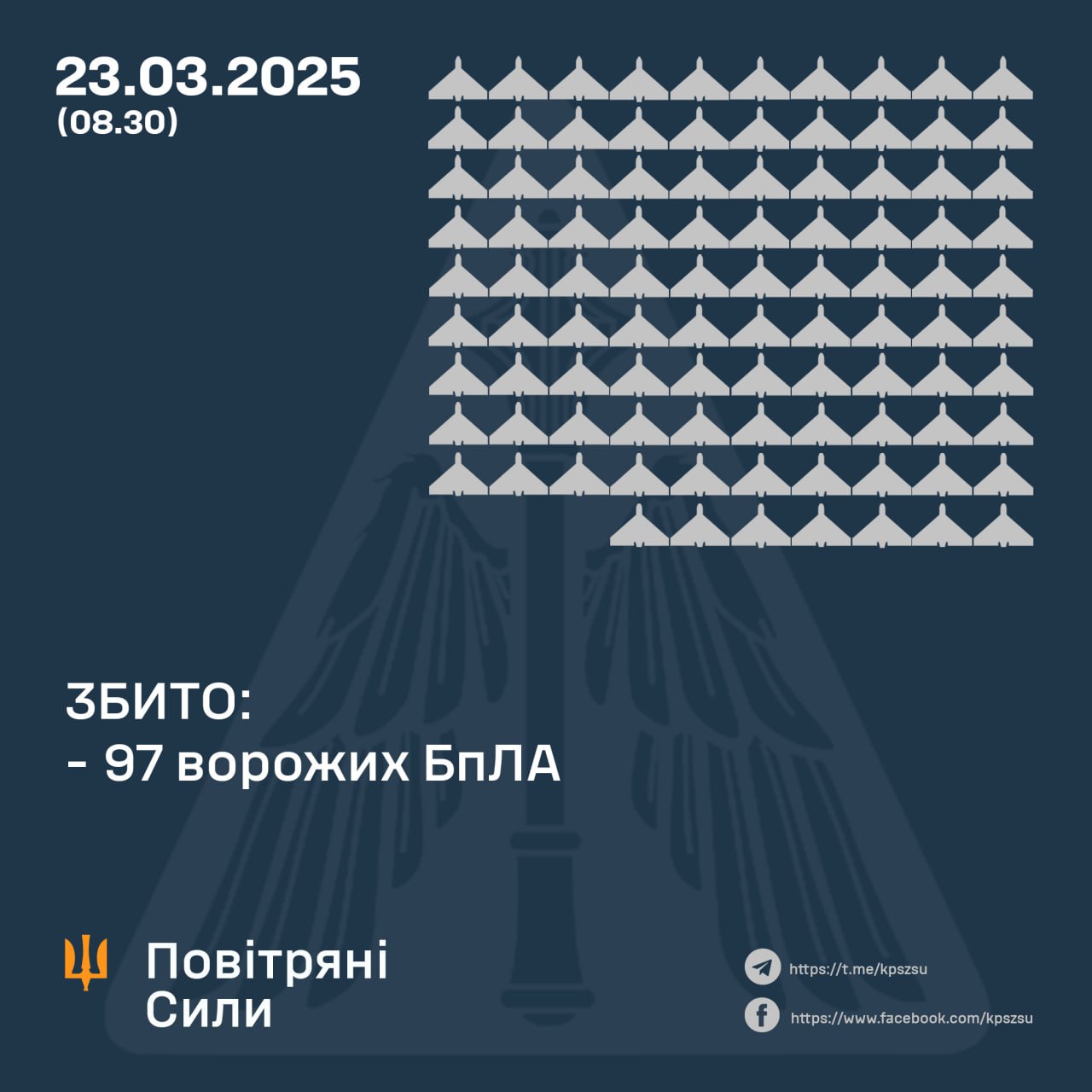 Станом на 08.30 підтверджено збиття 97 ударних БПЛА типу Shahed (безпілотників інших типів) на півдні, півночі, заході та в центрі країни.