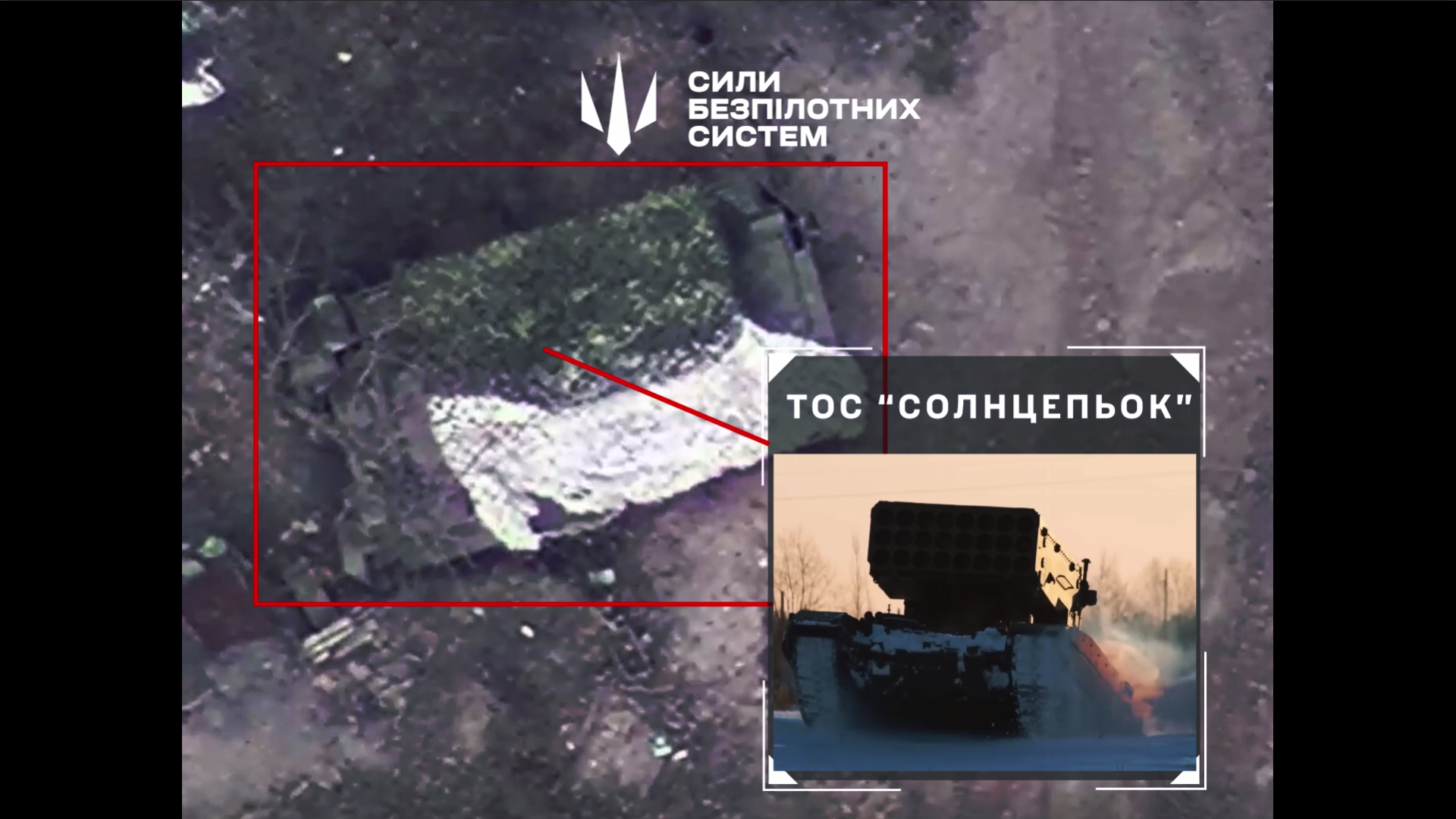 Оператори 413 батальйону «Рейд» СБС ЗСУ виявили та завдали точного удару по важкій вогнеметній системі залпового вогню ТОС-1А «Сонцепьок», яку окупанти намагалися сховати в посадці за 25 км від лінії фронту.