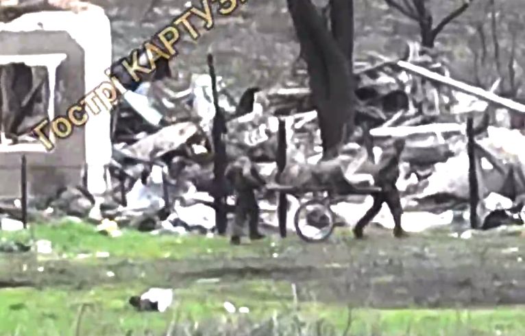 «Мародерні війська окупанта працюють не покладаючи рук та не миючи ніг. Цього разу двоє „асвабадітелей“ ходили по зруйнованих будинках з невеличким візком та збирали цінні речі українців які колись будували ці оселі», — йдеться у коментарі до оприлюднених кадрів.