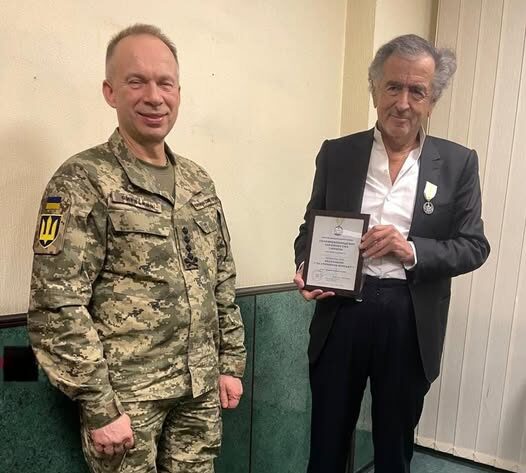 Головнокомандувач ЗСУ генерал Олександр Сирський вручив відзнаку Головнокомандувача Збройних Сил України «За сприяння війську» Бернару-Анрі Леві — французькому філософу, письменнику, документалісту, політичному журналісту та інтелектуалу.