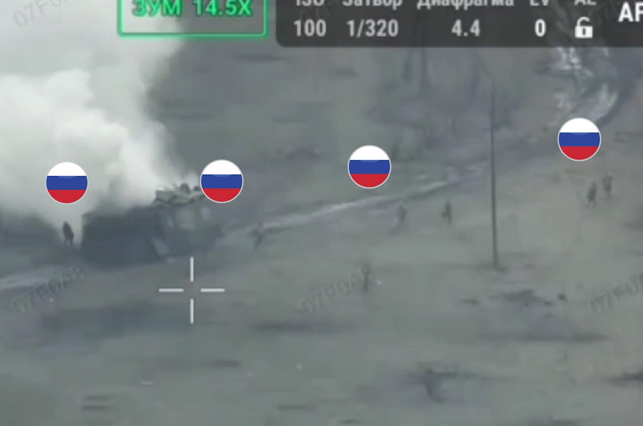 У ролику видно, як окупанти десантувалися з танка. Піхота поділилась на кілька груп і розбіглась. Незабаром їх атакували артилеристи.