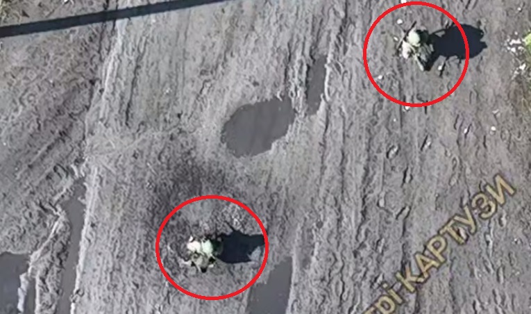 На оприлюднених кадрах видно, як український безпілотник скидає на дорогу, по якій йдуть двоє окупантів, осколковий боєприпас, внаслідок чого один з них отримує поранення і починає стікати кров’ю.