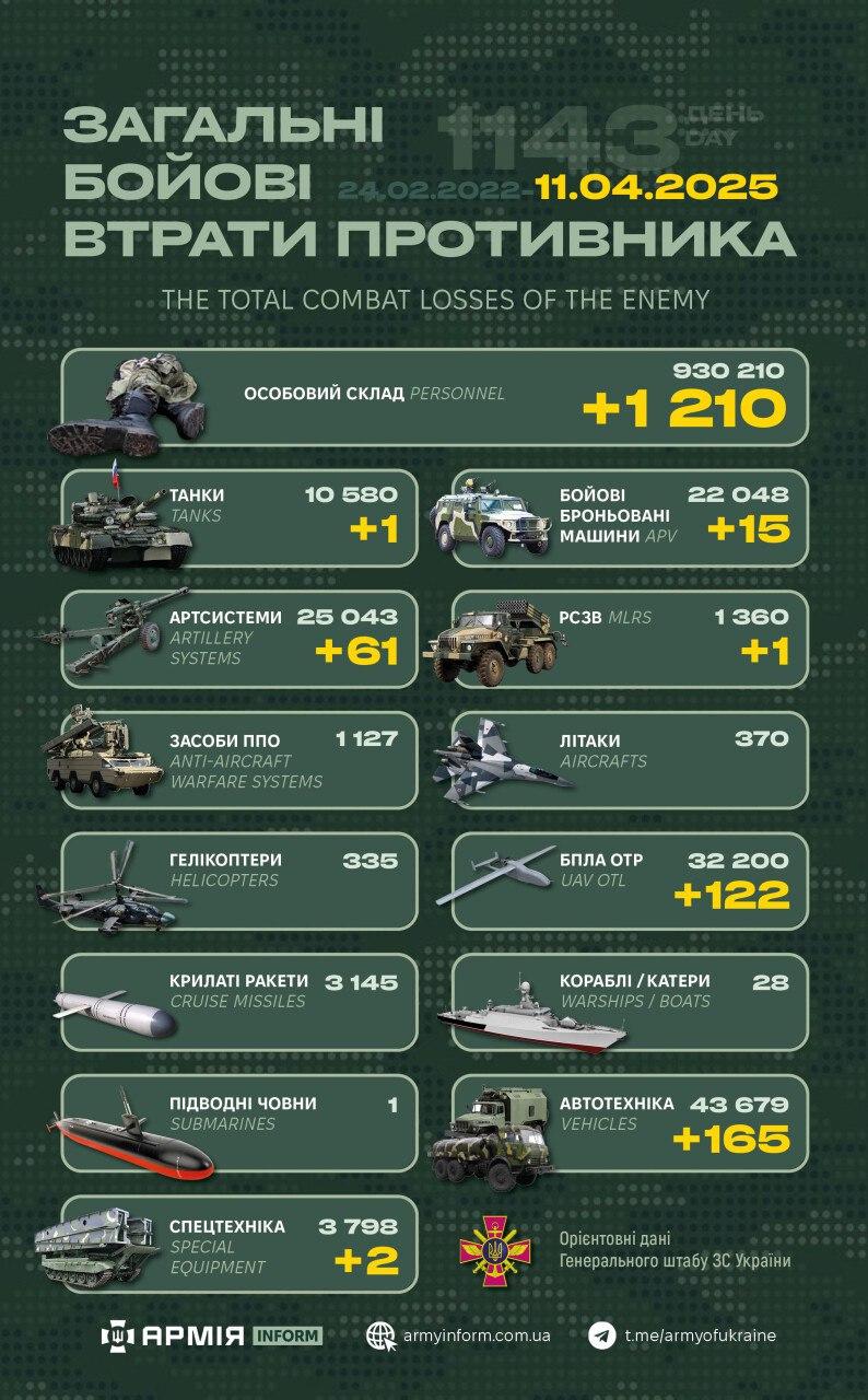 Загальні бойові втрати противника з 24.02.22 по 11.04.25 орієнтовно становлять: