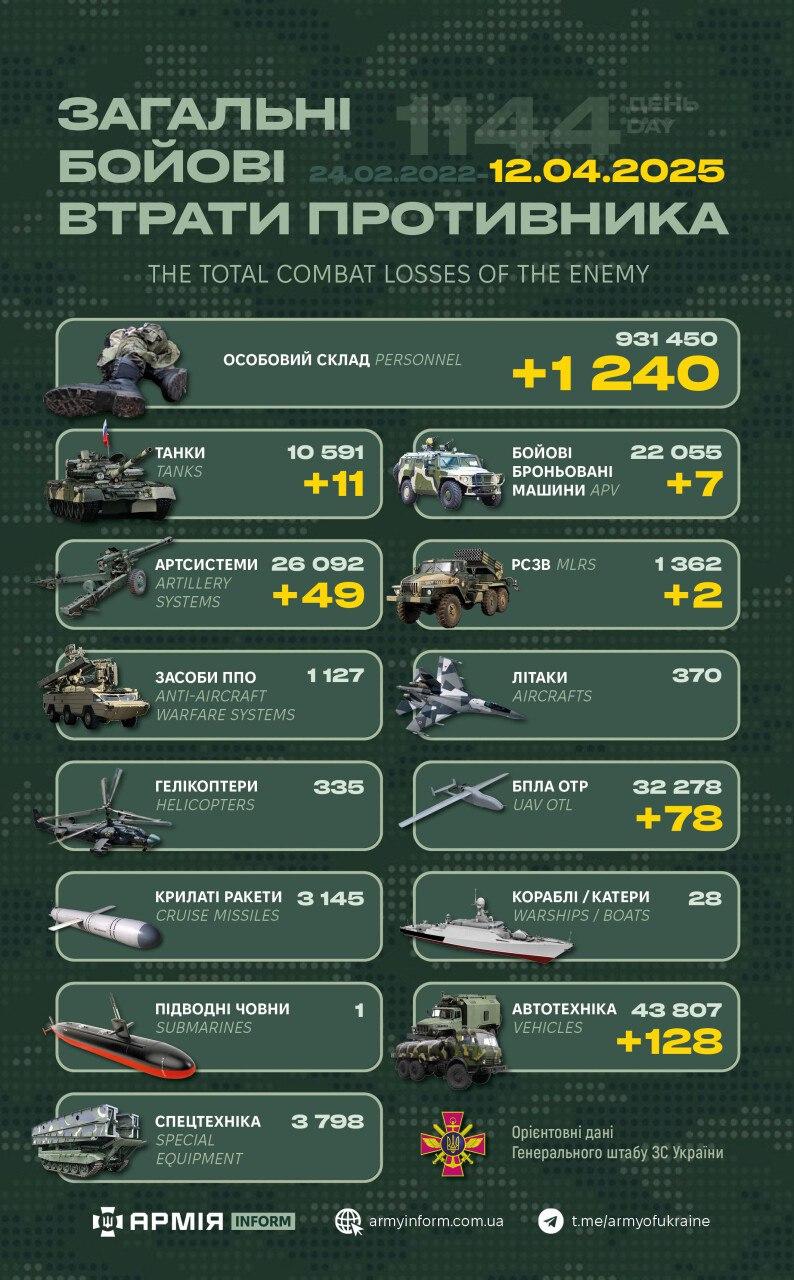 Загальні бойові втрати противника з 24.02.22 по 12.04.25 орієнтовно становлять: