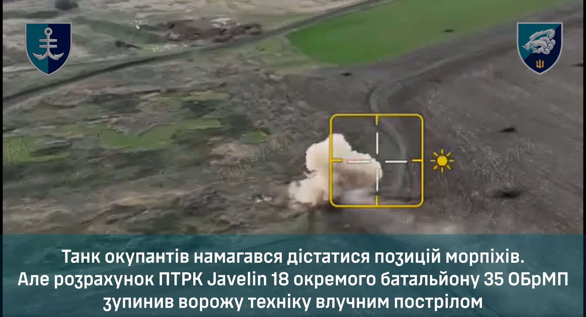 Розрахунок протитанкового ракетного комплексу Javelin 18 батальйону морської піхоти 35 бригади морської піхоти імені контрадмірала Михайла Остроградського уразив ворожий танк.