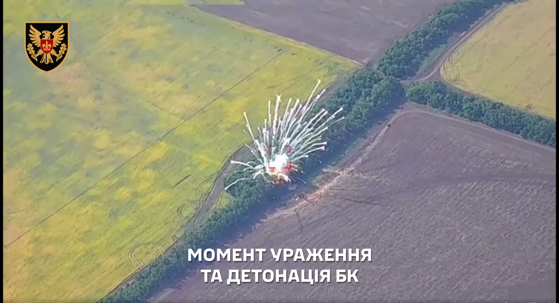 Український FPV-безпілотник осідлав пускозаряджальну установку зенітно-ракетного комплексу БУК-М3, проїхав на ній близько 15 кілометрів, після чого самоліквідувався, знищивши ворожу техніку.