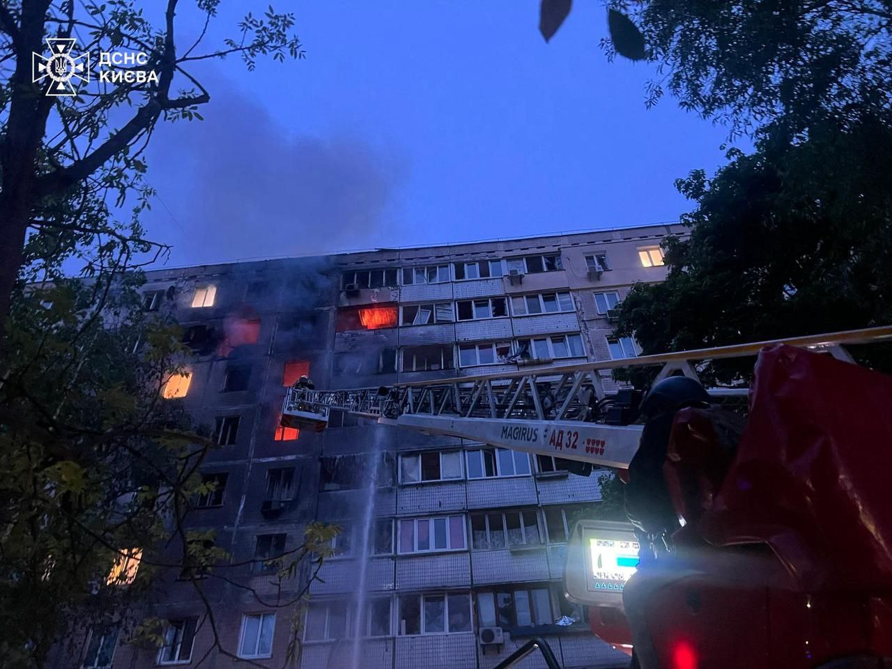 «У Святошинському районі столиці пожежі в кількох квартирах на верхніх поверхах житлового будинку. У Дніпровському — руйнування на верхньому поверсі будинку. У Соломʼянському зафіксували падіння уламків БПЛА в районі нежитлової забудови. Без займання», — йдеться в повідомленні.