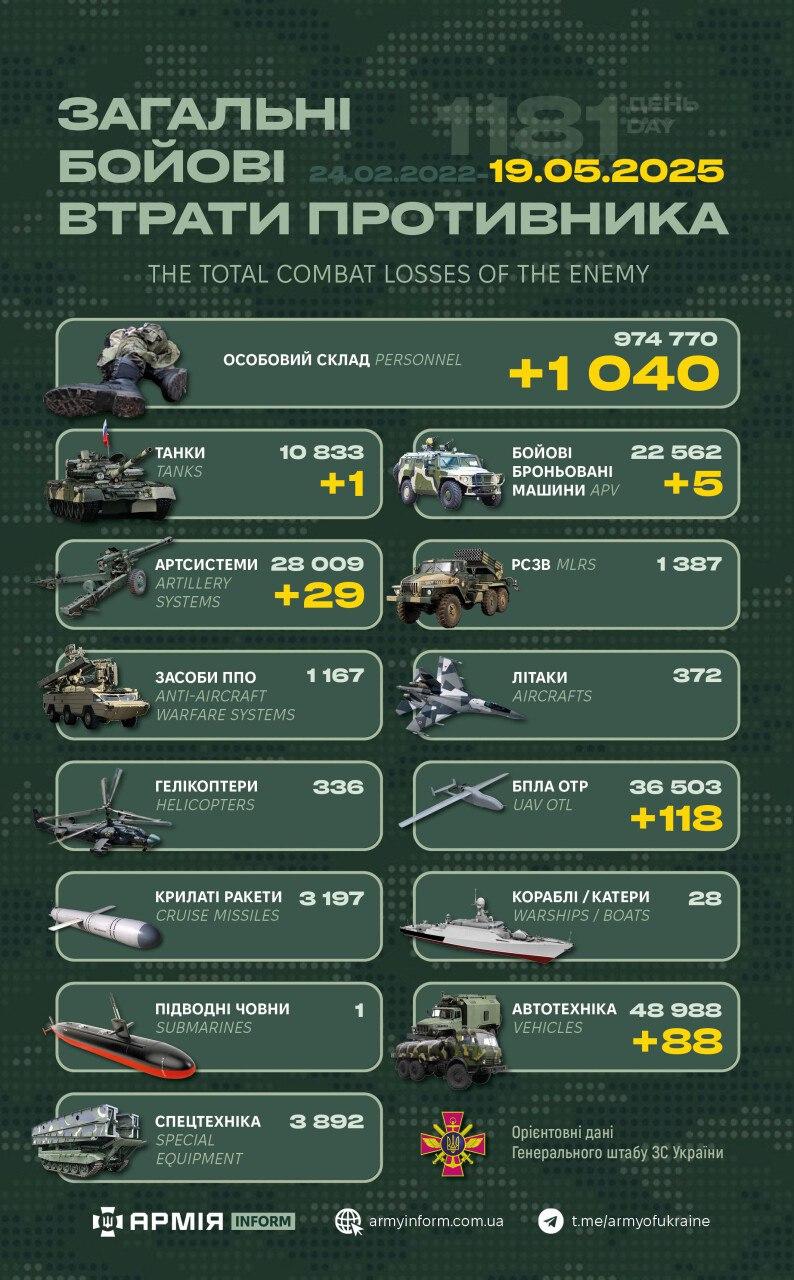 Загальні бойові втрати противника з 24.02.22 по 19.05.25 орієнтовно становлять: