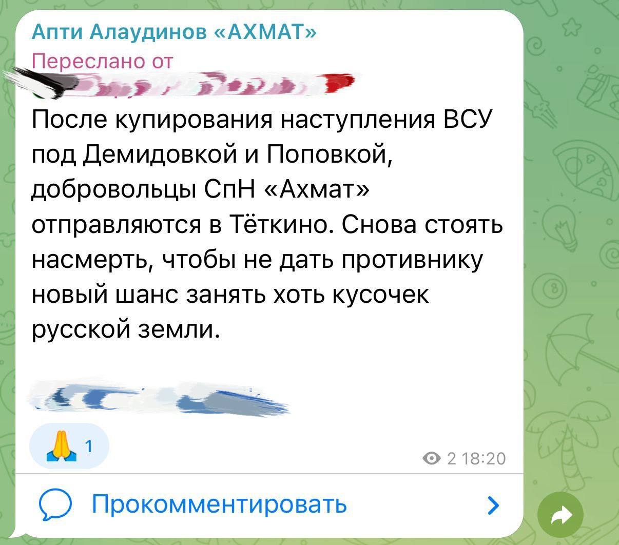 При цьому 225 ОШП також оприлюднив пост ватажка кадировців Апті Алаудінова, який хизувався відправкою своїх людей в Тьоткіно Курської області.