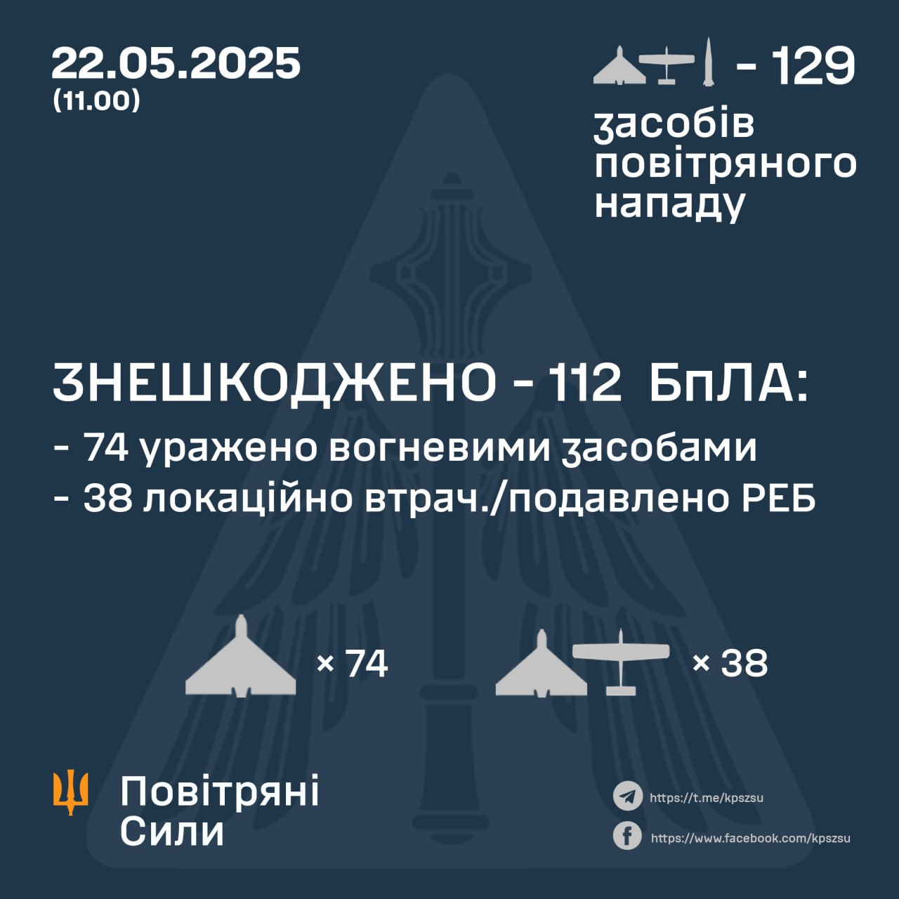 При цьому зазначається, що завдяки українській авіації, зенітним ракетним військам, мобільним вогневим групам, а також підрозділам РЕБ та безпілотних систем вдалося знешкодити 112 ворожих БПЛА.