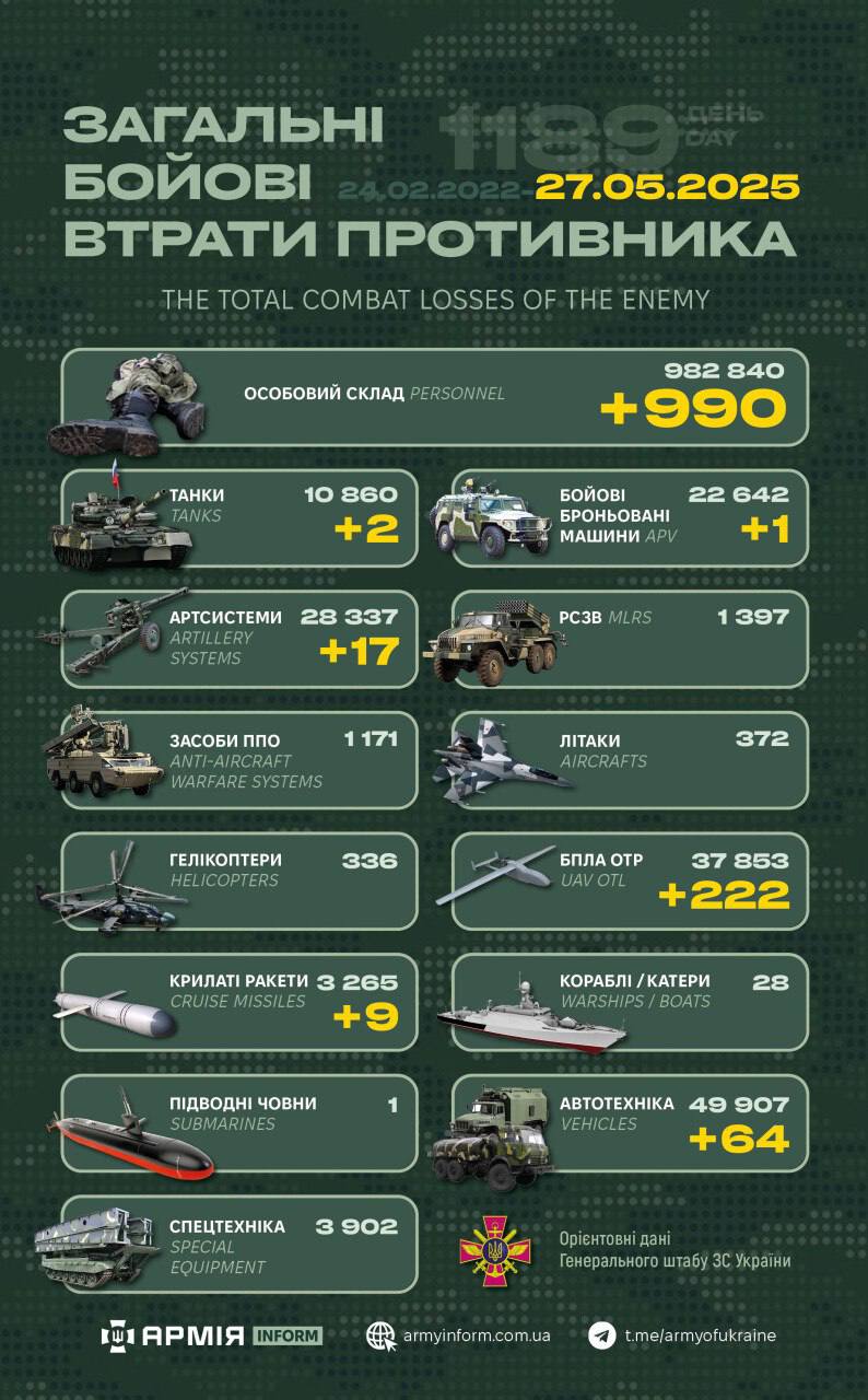 Так, загальні бойові втрати противника з 24.02.22 по 27.05.25 орієнтовно становлять:
