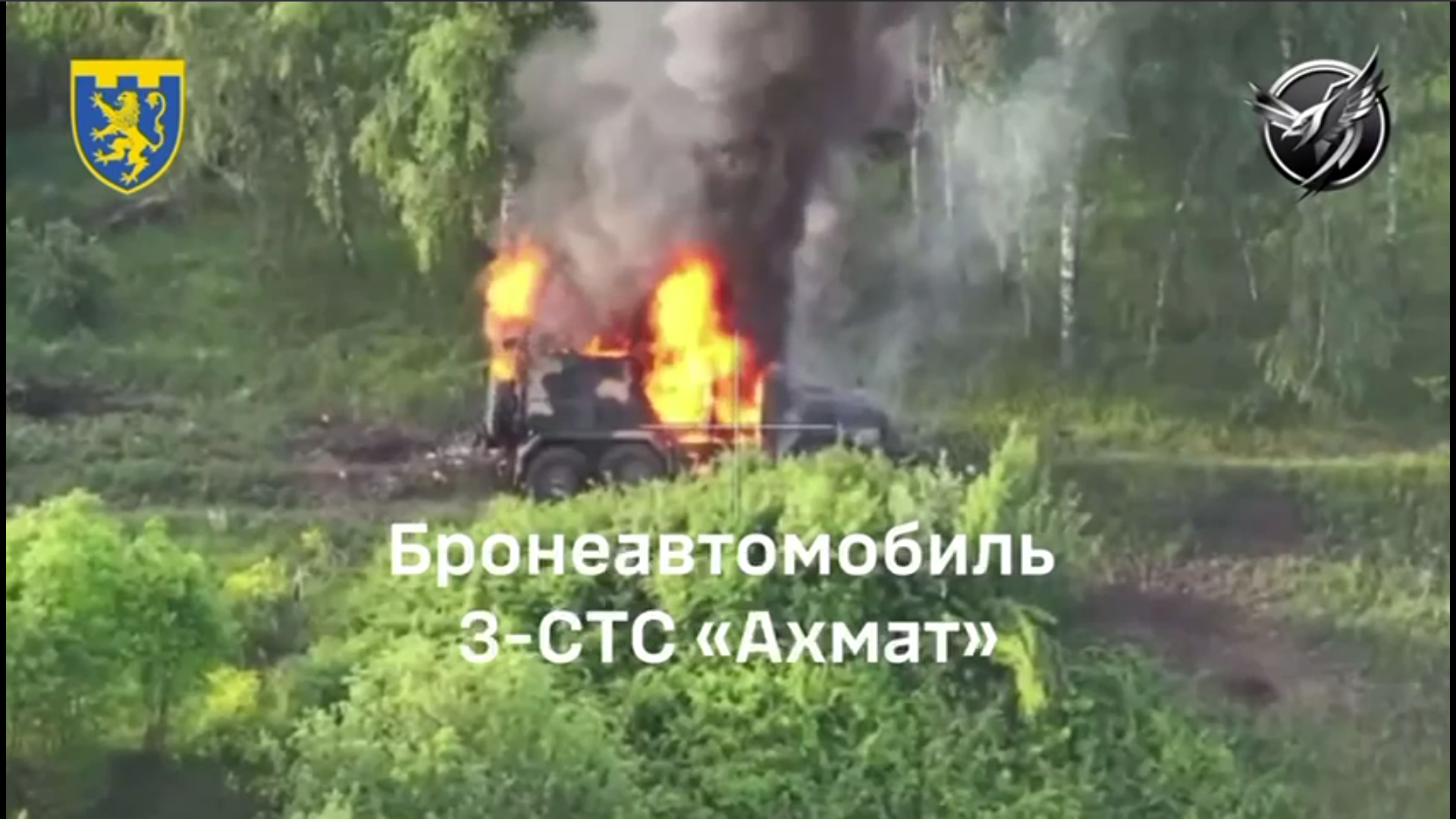 Екіпаж «Вій» роти ударних безпілотних авіакомплексів «Чорний Стриж» 103 бригади ТрО імені Андрея Шептицького знищив один із найновіших бронеавтомобілів російської армії — З-СТС «Ахмат».