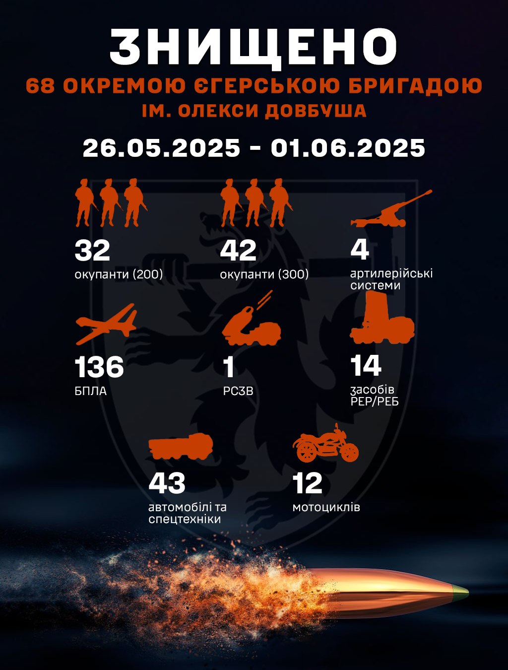 При цьому усього з початку ведення бойових дій 68 бригада завдала противнику таких втрат: