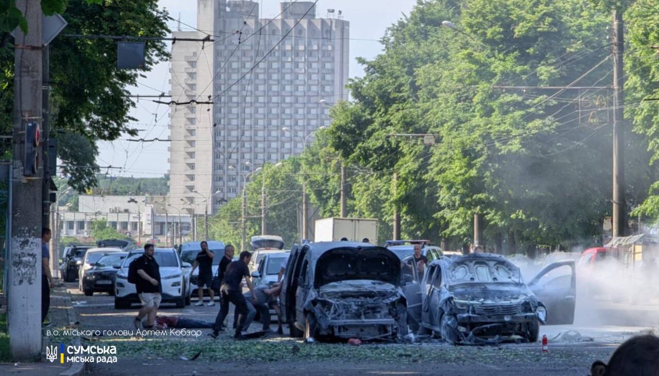 «Ворог поцілив в автівки у центрі Сум. На місці влучання вщент згоріли два автомобілі. На жаль, внаслідок ворожого удару загинула одна людина. Є багато поранених. Людей доставляють до медичних закладів обласного центру», — йдеться в повідомленні.