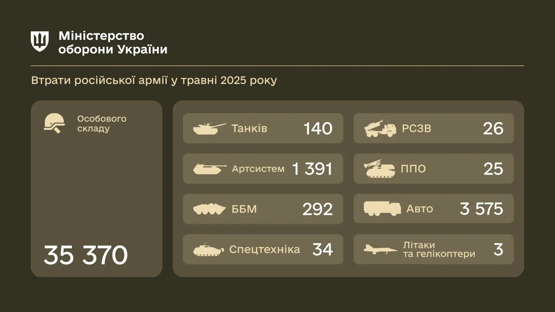 Також у травні наші воїни знищили та підбили 140 танків (це кількість стволів 4.5 танкових батальйонів), 292 бойові бронемашини, 26 реактивних систем залпового вогню, 25 дороговартісних засобів протиповітряної оборони, 3 575 військових автомобілів, 34 одиниці спеціальної техніки. Крім того, утилізували 2 літаки та гелікоптер.