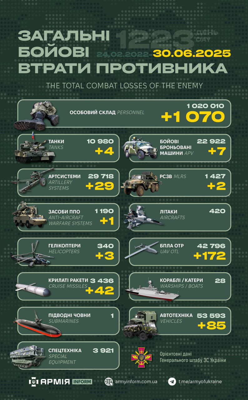 Загальні бойові втрати противника з 24.02.22 по 30.06.25 орієнтовно становлять: