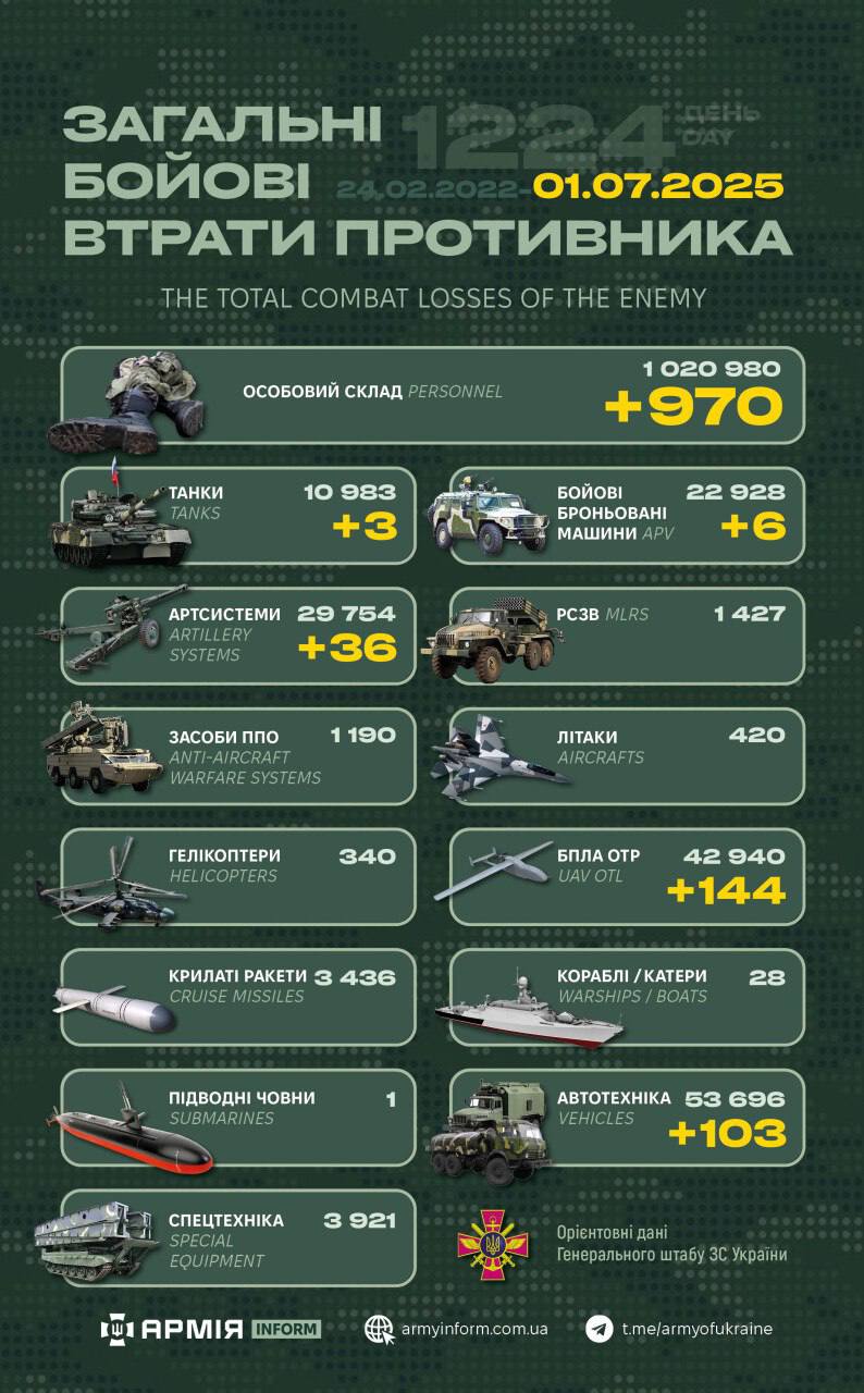 Так, загальні бойові втрати противника з 24.02.22 по 01.07.25 орієнтовно становлять:
