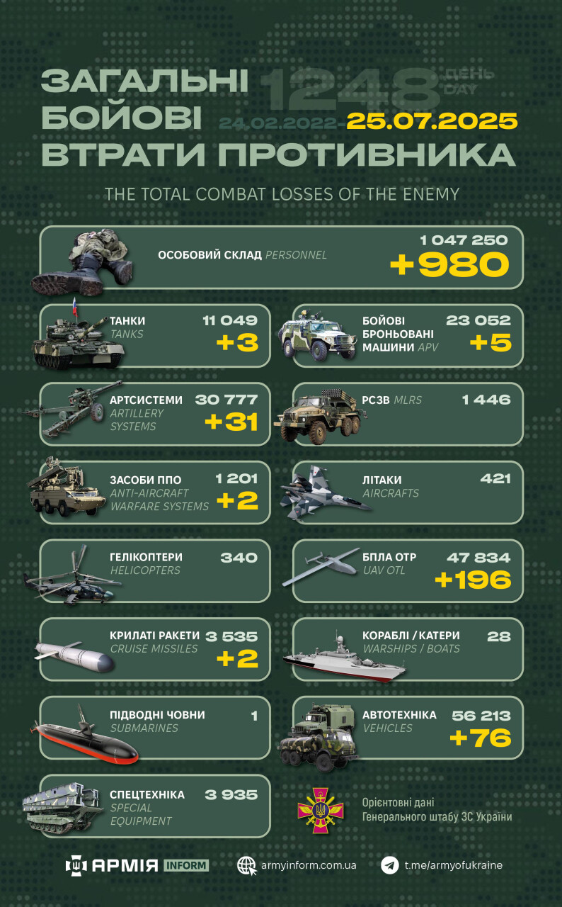 Загальні бойові втрати противника з 24.02.22 по 25.07.25 орієнтовно становлять:
