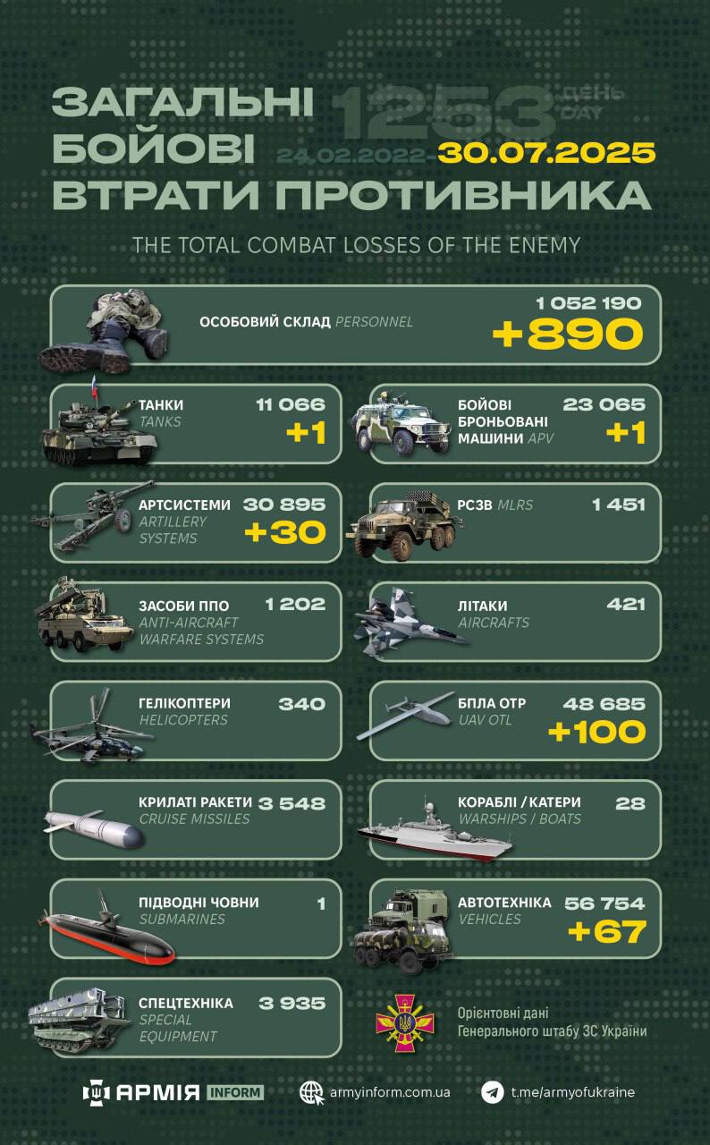 Загальні бойові втрати противника з 24.02.22 по 30.07.25 орієнтовно становлять:
