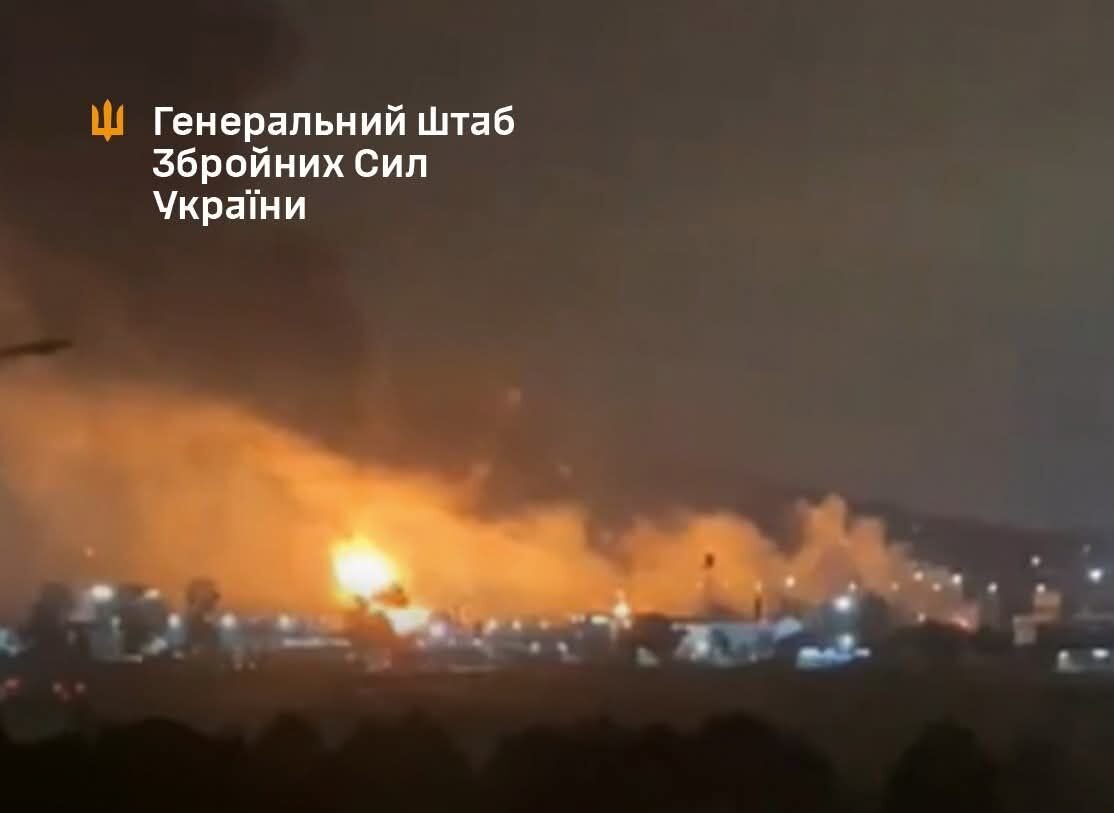 На території об’єкта здійнялася сильна пожежа. Відомо, що на летовищі також розміщувалася армійська авіація російських загарбників.