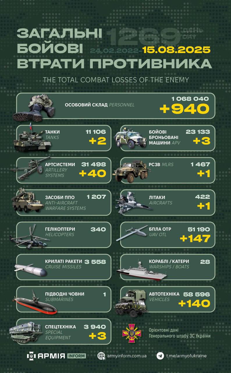 Загальні бойові втрати противника з 24.02.22 по 15.08.25 орієнтовно становлять: