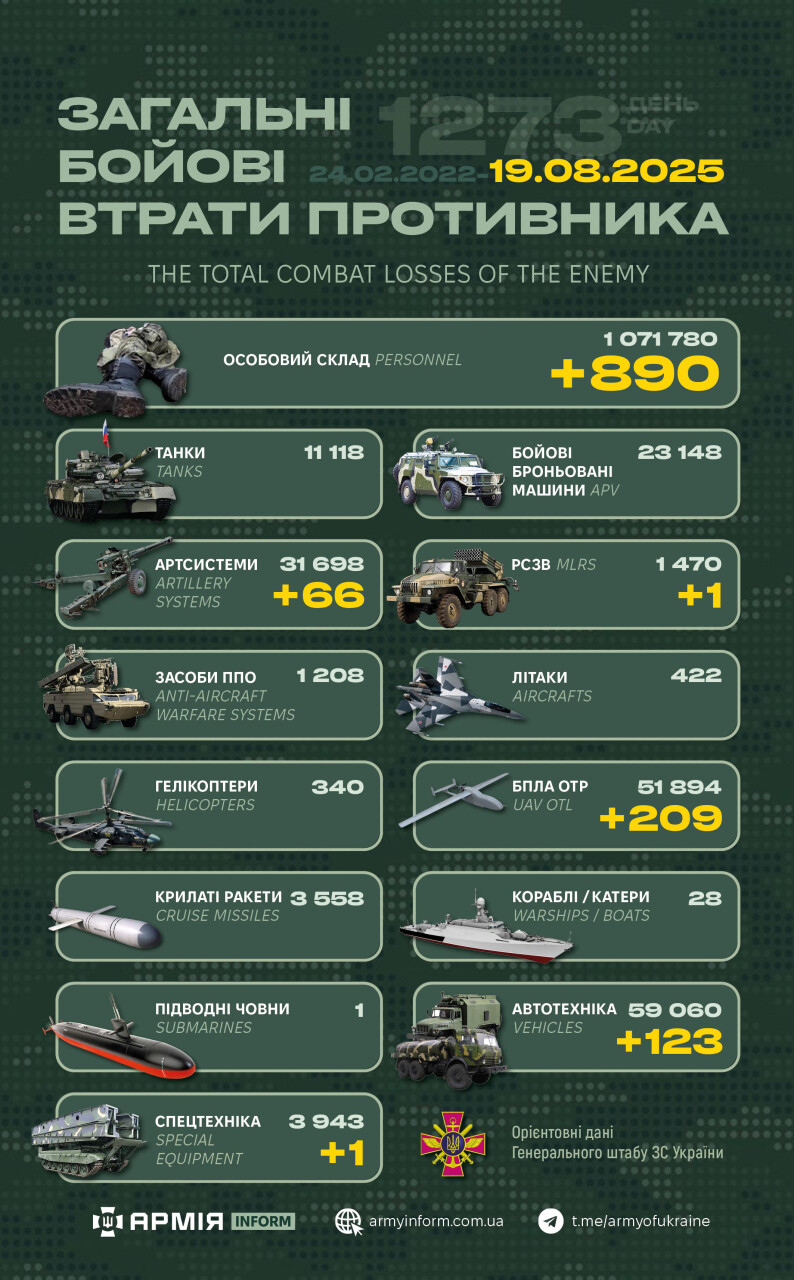 Загальні бойові втрати противника з 24.02.22 по 19.08.25 орієнтовно становлять: