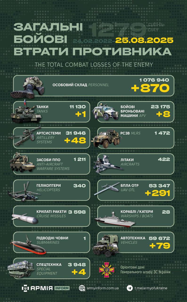 Загальні бойові втрати противника з 24.02.22 по 25.08.25 орієнтовно становлять: