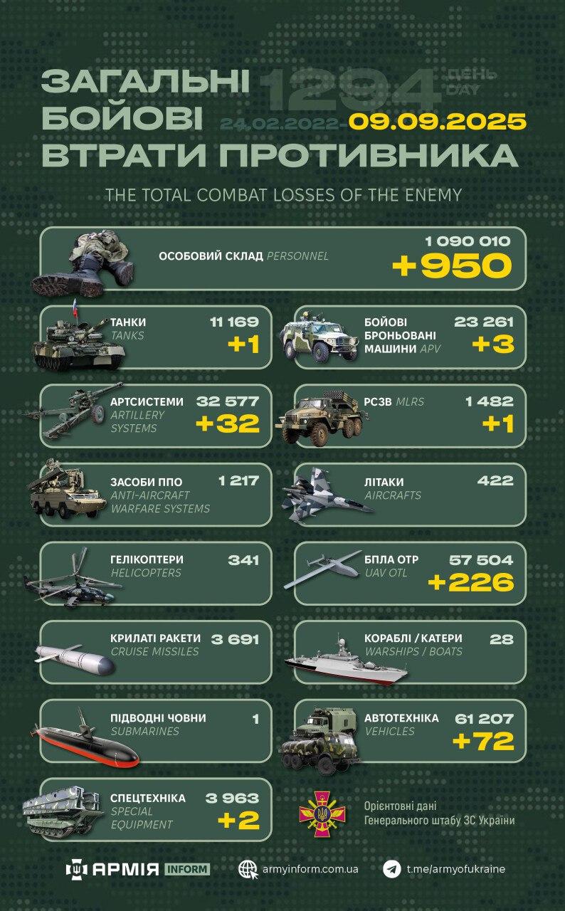 Загальні бойові втрати противника з 24.02.22 по 09.09.25 орієнтовно становлять: