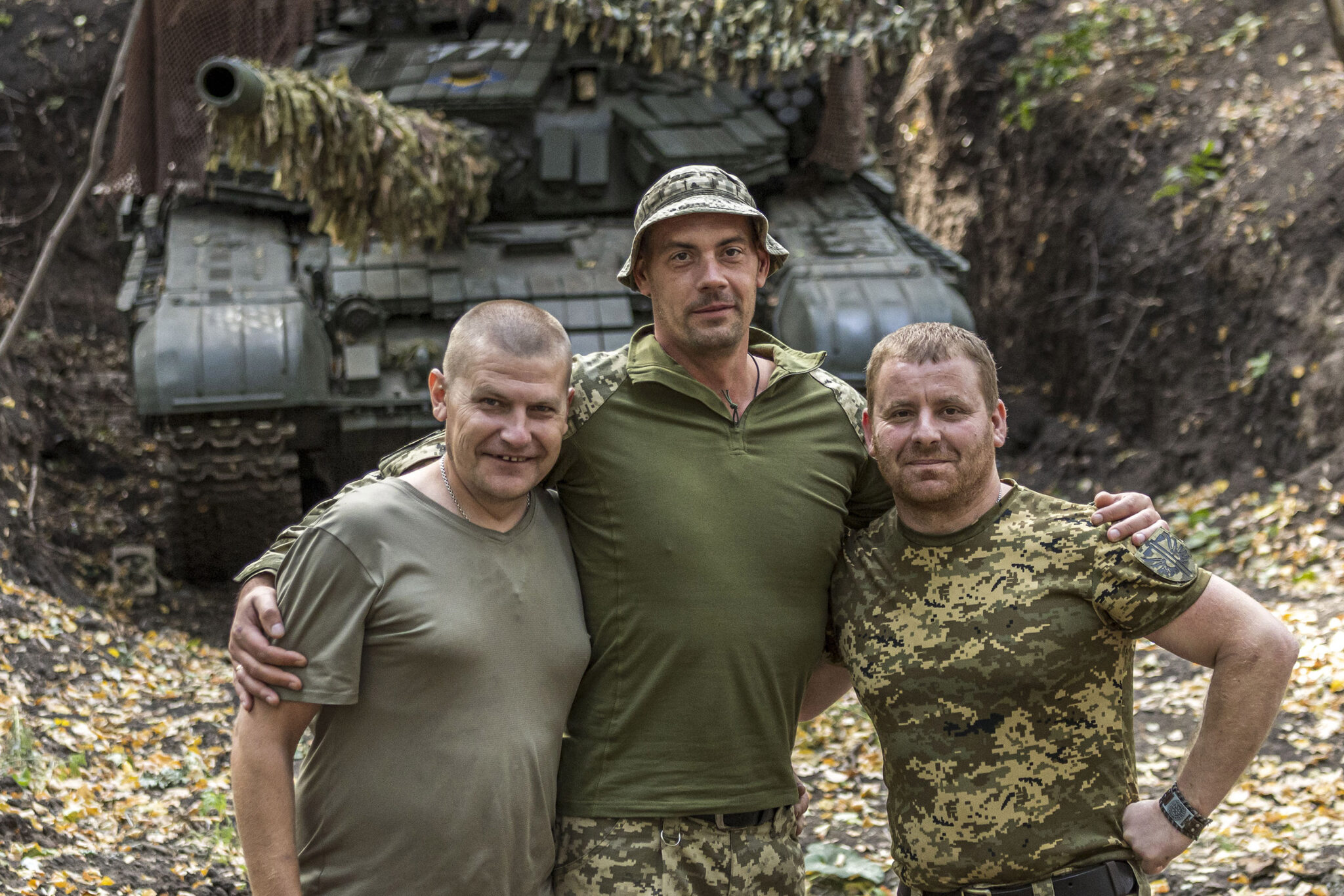 Знайомтесь (зліва направо): водій-механік — «Джексон», командир — «Ляля» і навідник — «Пітон». Це екіпаж «сімдесят двійки» танкової роти 77 окремої аеромобільної бригади ДШВ.