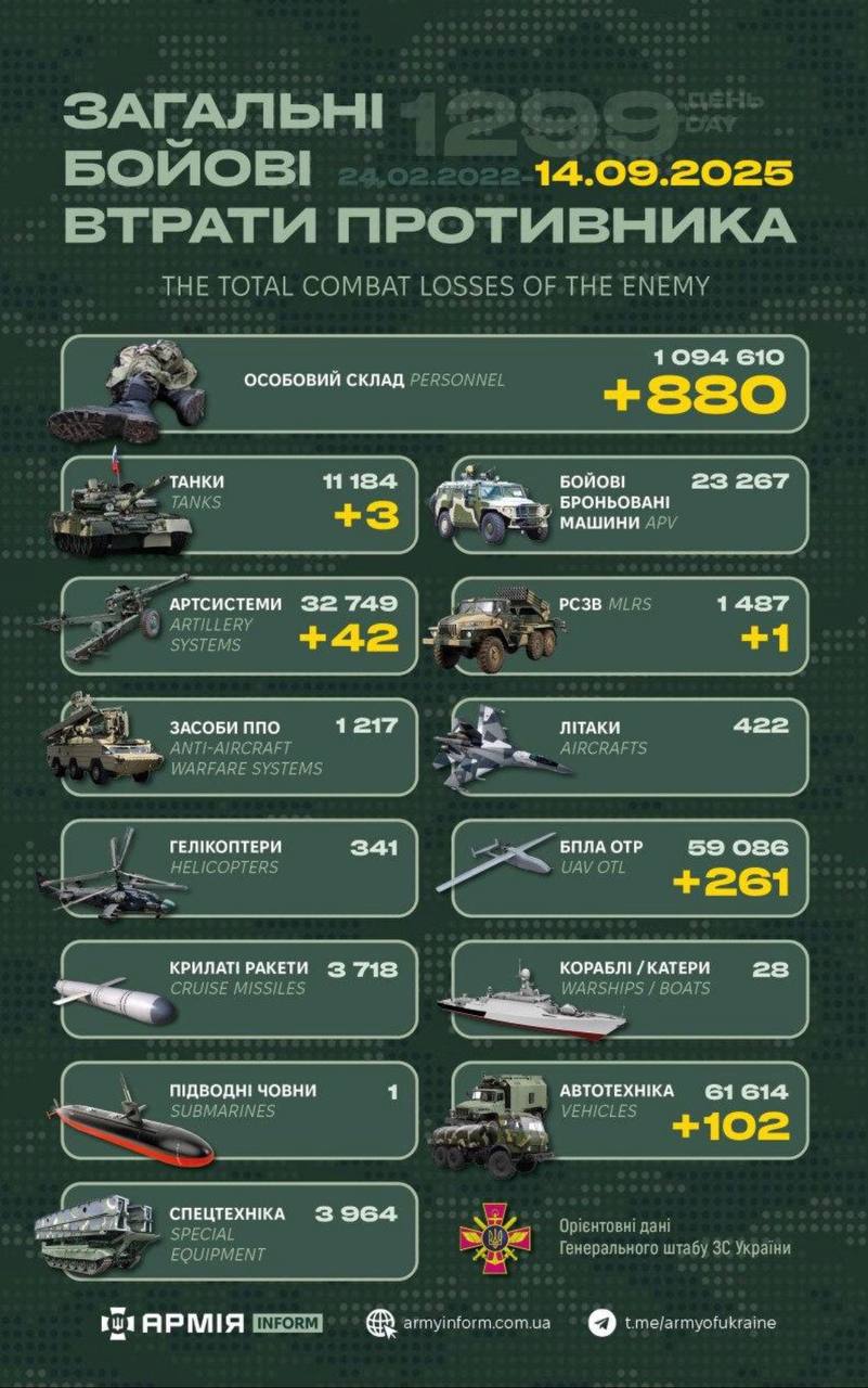 Таким чином загальні бойові втрати противника з 24.02.22 по 14.09.25 орієнтовно становлять: