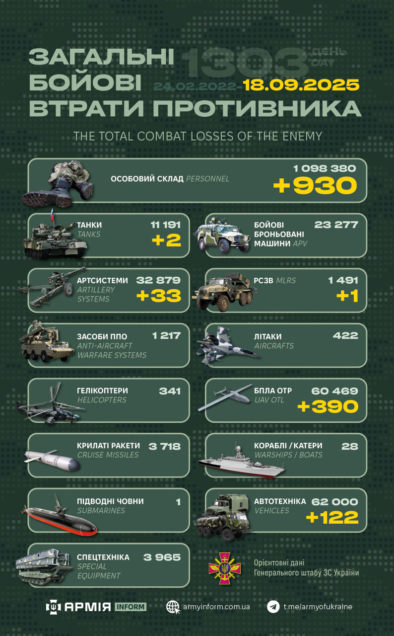Загальні бойові втрати противника з 24.02.22 по 18.09.25 орієнтовно становлять: