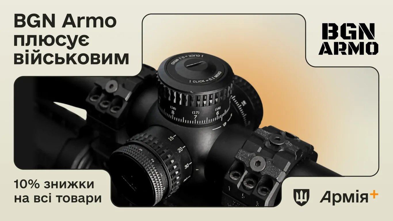 Пропозиція партнера — 10% знижки на весь асортимент на сайті компанії. До нього входять кріплення для оптики, тюнінг зброї та інші аксесуари. Щоб скористатися пропозицією, у застосунку перейдіть до сервісу Плюси, оберіть BGN Armo та натисніть «Згенерувати код». Потім введіть код під час замовлення на сайті — і знижка активується. Промокод можна використовувати під час кожної покупки протягом місяця.