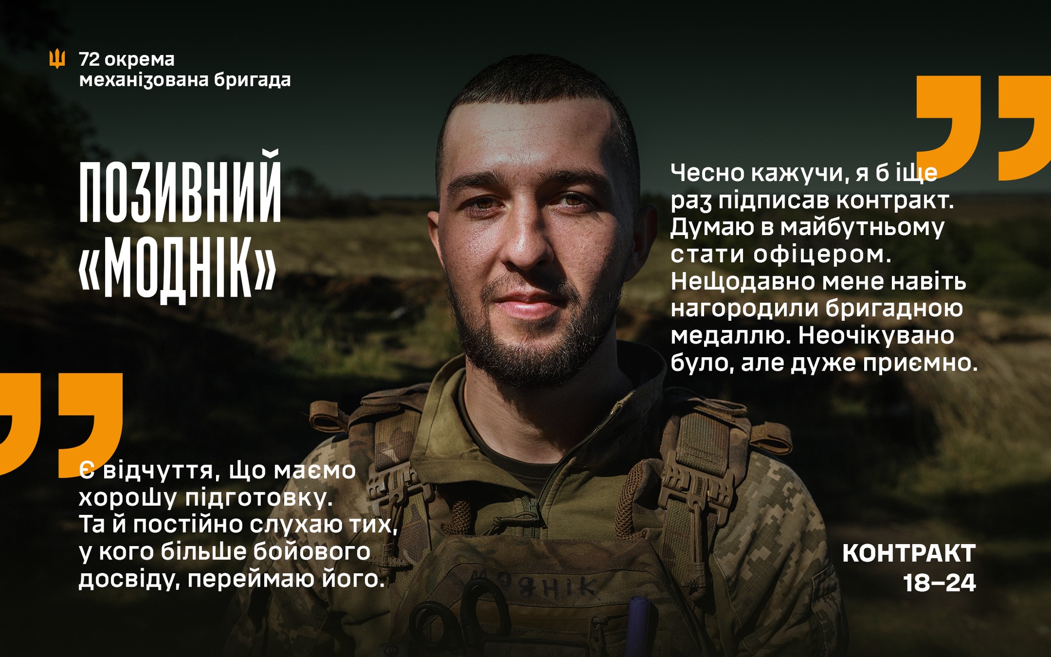 «Я — „Моднік“, бо навчався у Львівському фаховому коледжі індустрії моди (КНУТД). Хотів стати військовослужбовцем ще у 2022-му, але батьки були проти. Пів року тому підписав контракт із 72-ою, мамі про рішення сказав уже на БЗВП. Зараз я — гранатометник», — каже він.