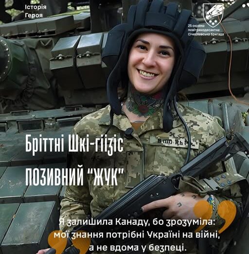 Канадська військова Бріттні Шкі-Гіізіс, яка п’ять років служила танкісткою у своїй країні, а потім навчала українців на «Леопардах», розповіла, як залишила службу, щоб стати на захист України, та як на фронті їй довелося боротися не лише з ворогом, а й зі стереотипами про те, що «жінці не місце в танку».