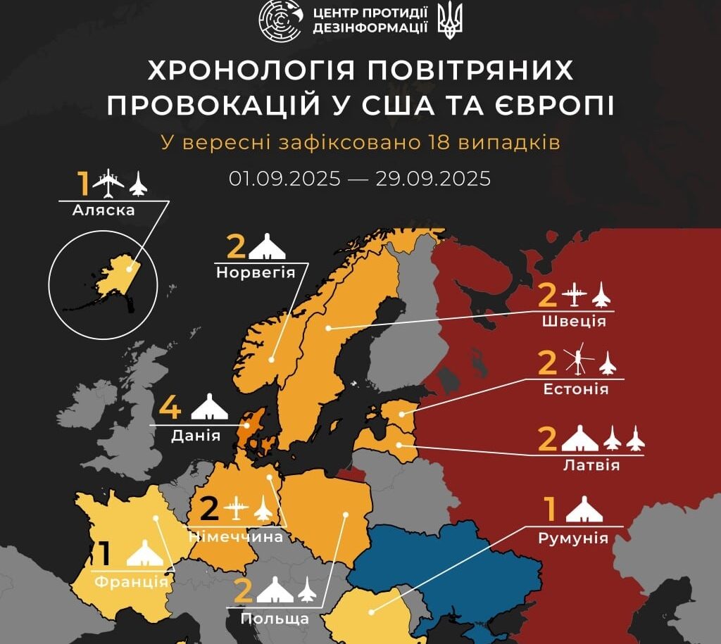 Центр протидії дезінформації при РНБО України зафіксував різке зростання гібридних провокацій рф у повітряному просторі країн НАТО та США. У період з 1 по 29 вересня задокументовано 18 інцидентів — більш ніж утричі більше, ніж у серпні.