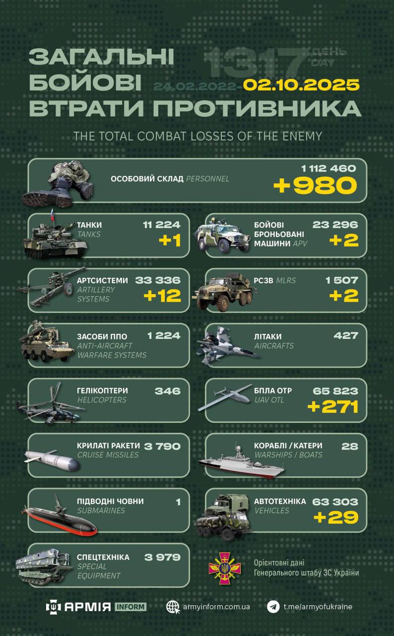 Таким чином загальні бойові втрати противника з 24.02.22 по 02.10.25 орієнтовно становлять: