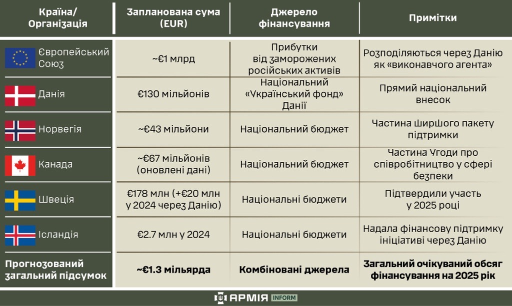 На 2025 рік прогнозується, що загальний обсяг підтримки за цим механізмом сягне 1,3 мільярда євро. Це результат багатонаціональних зусиль, що включає такі компоненти: