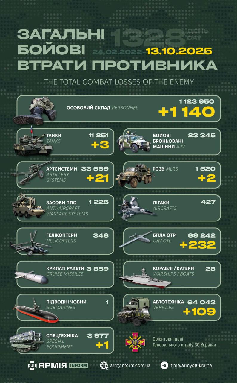 Таким чином загальні бойові втрати противника з 24.02.22 по 13.10.25 орієнтовно становлять: