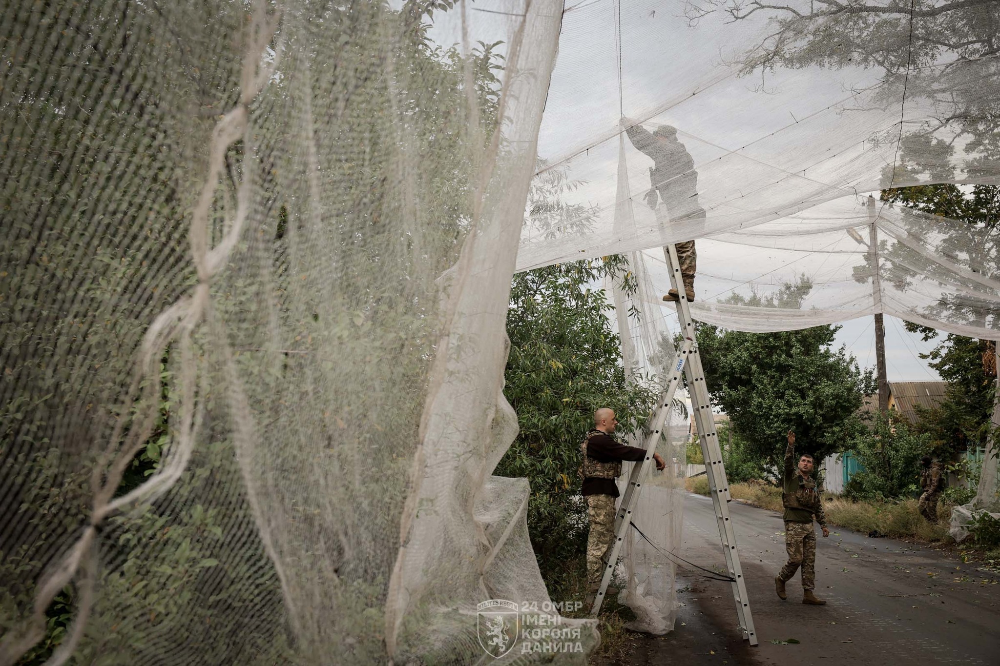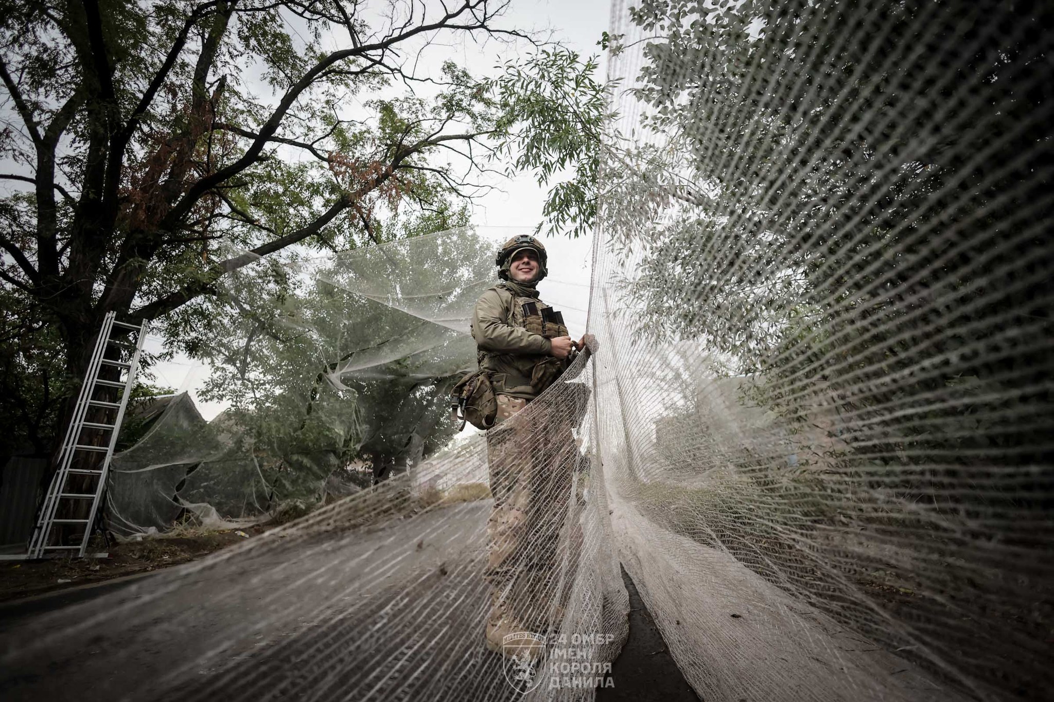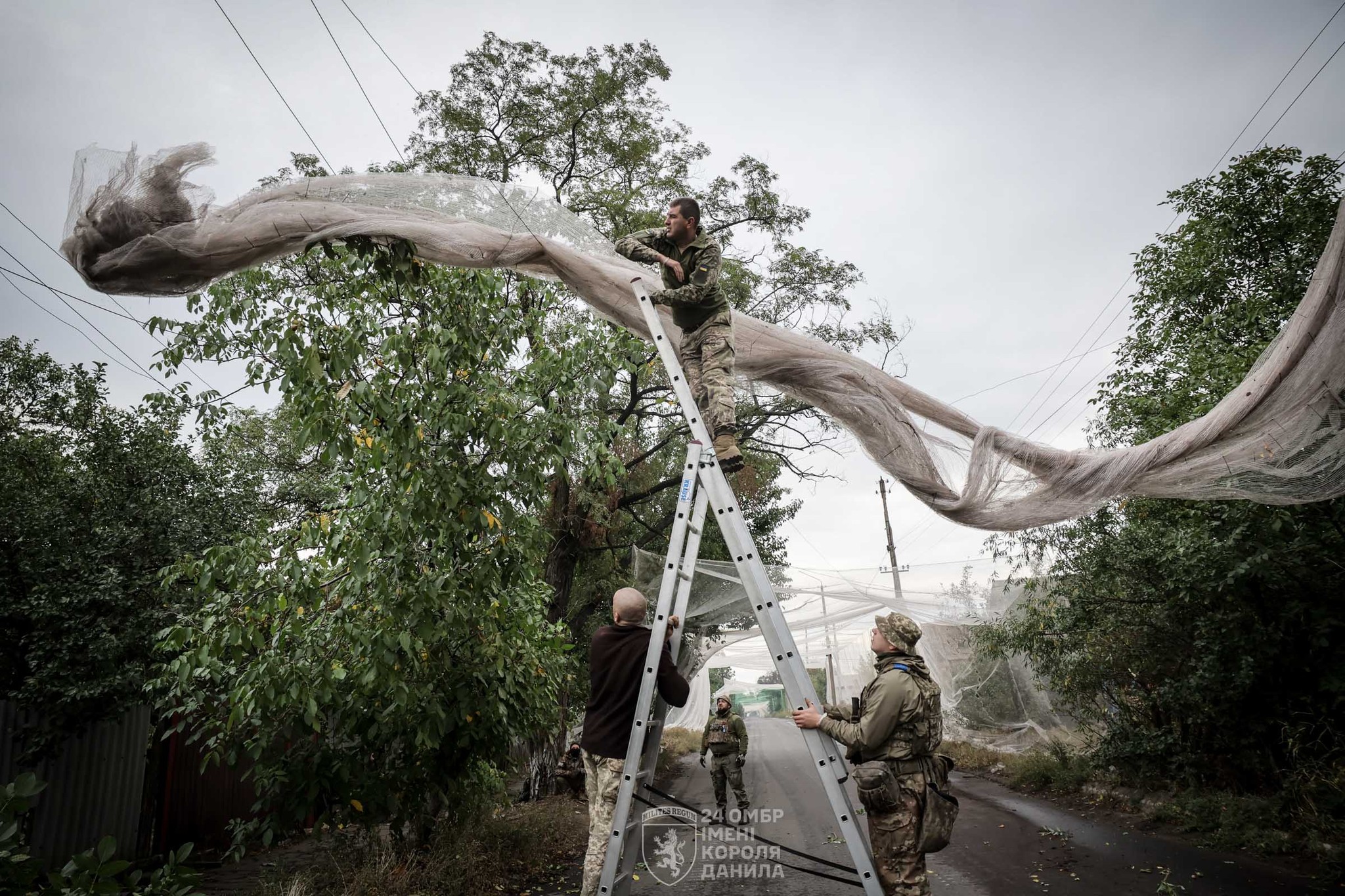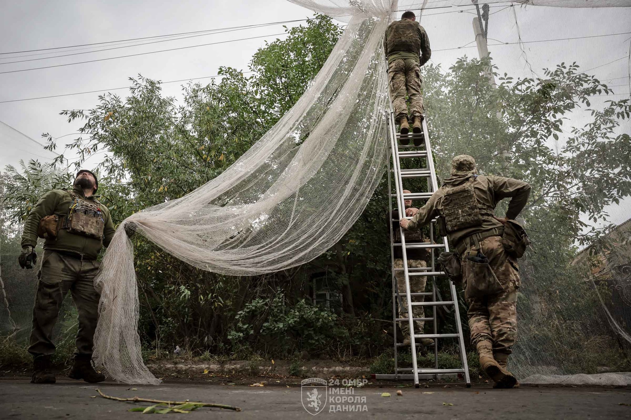 У прифронтовій Костянтинівці бійці зенітно-ракетного артилерійського дивізіону 24-ї окремої механізованої бригади натягують над дорогами захисні сітки, щоб убезпечити військову логістику та транспорт від атак російських FPV-дронів.