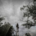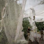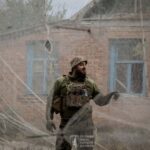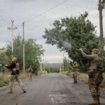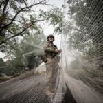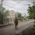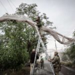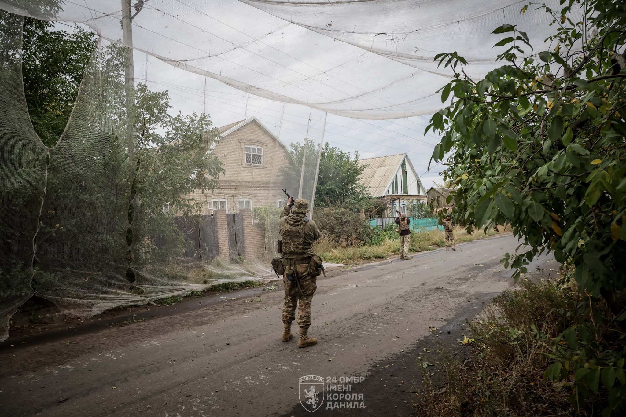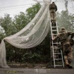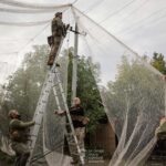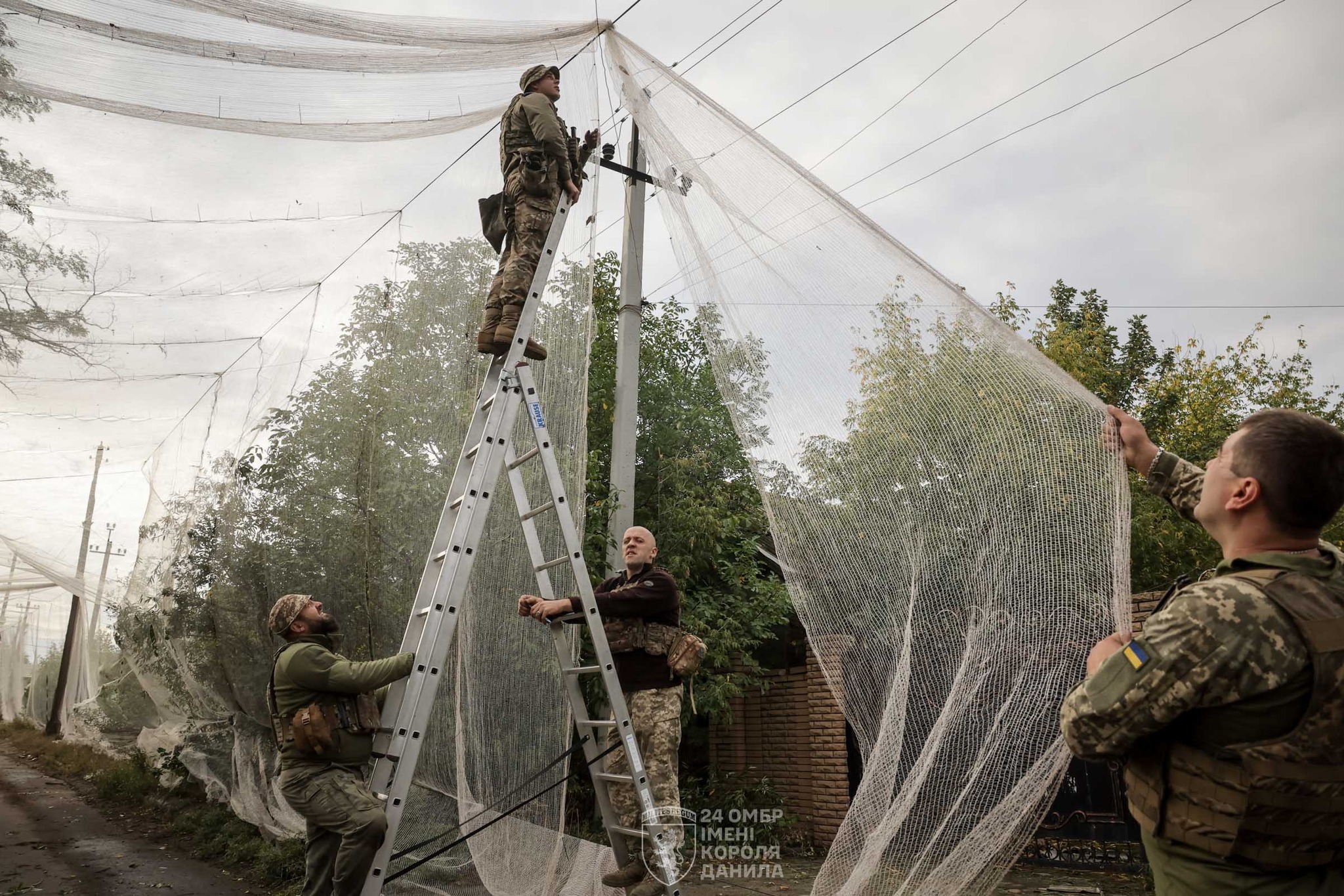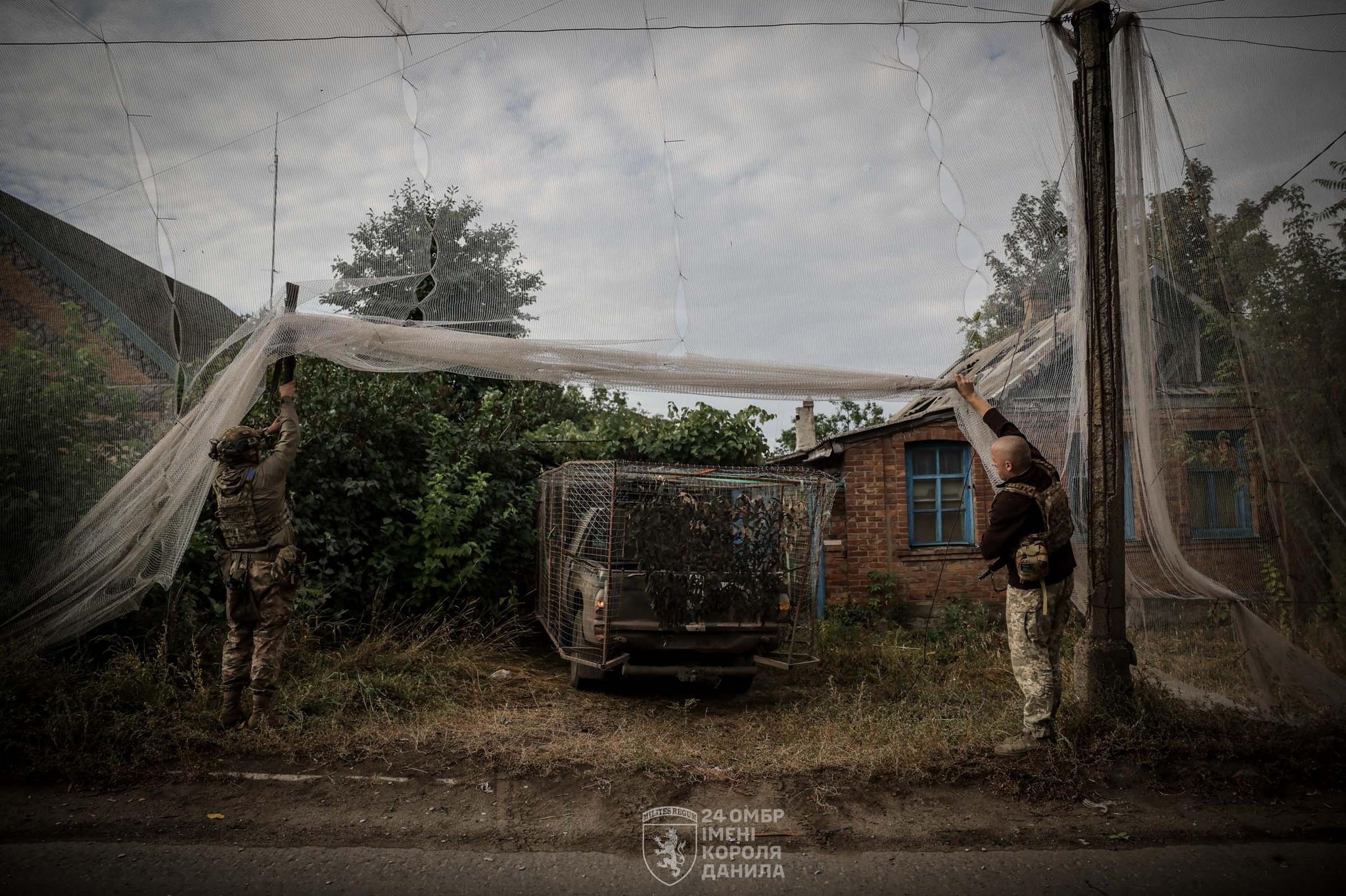 У прифронтовій Костянтинівці бійці зенітно-ракетного артилерійського дивізіону 24-ї окремої механізованої бригади натягують над дорогами захисні сітки, щоб убезпечити військову логістику та транспорт від атак російських FPV-дронів.
