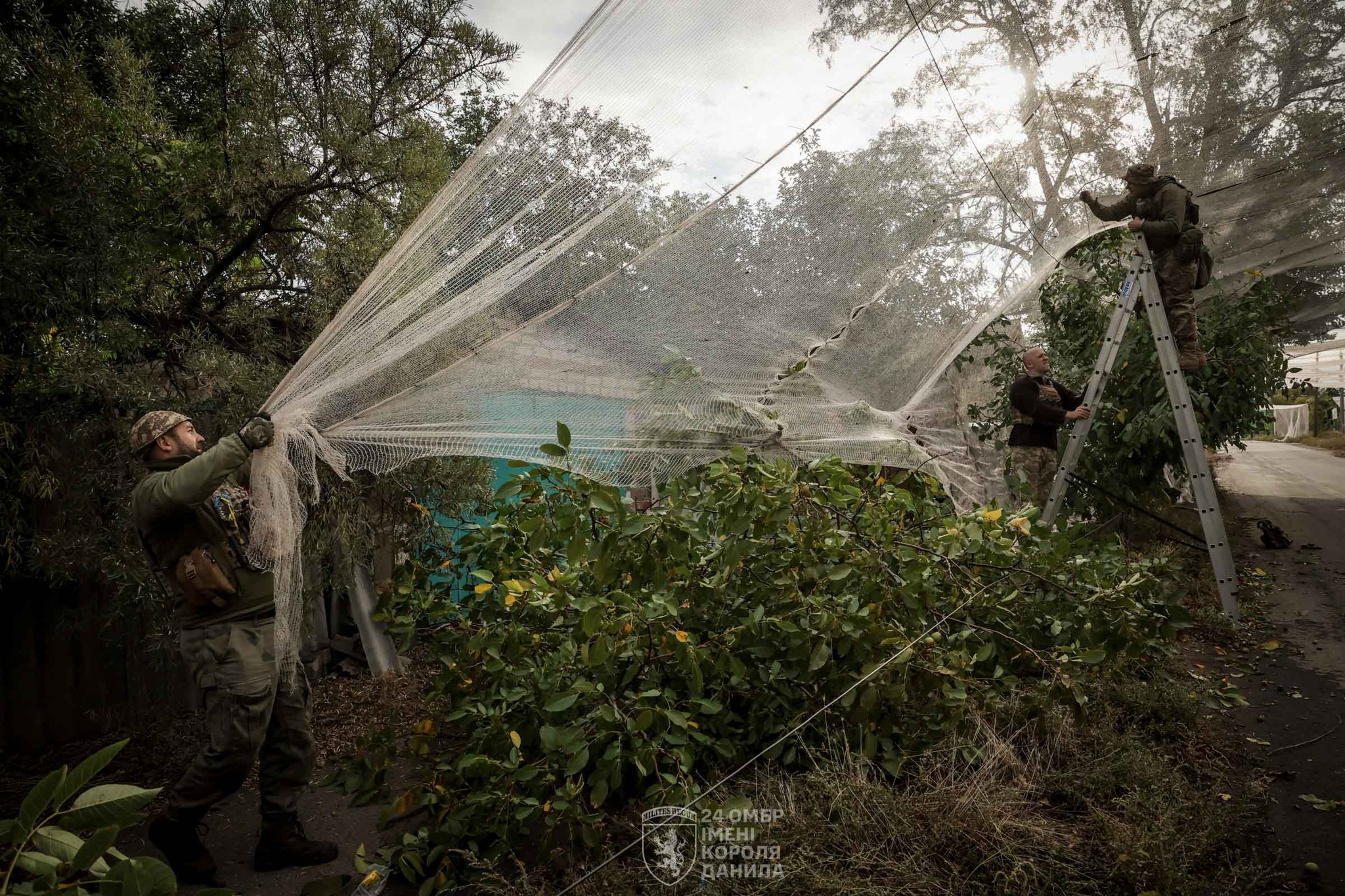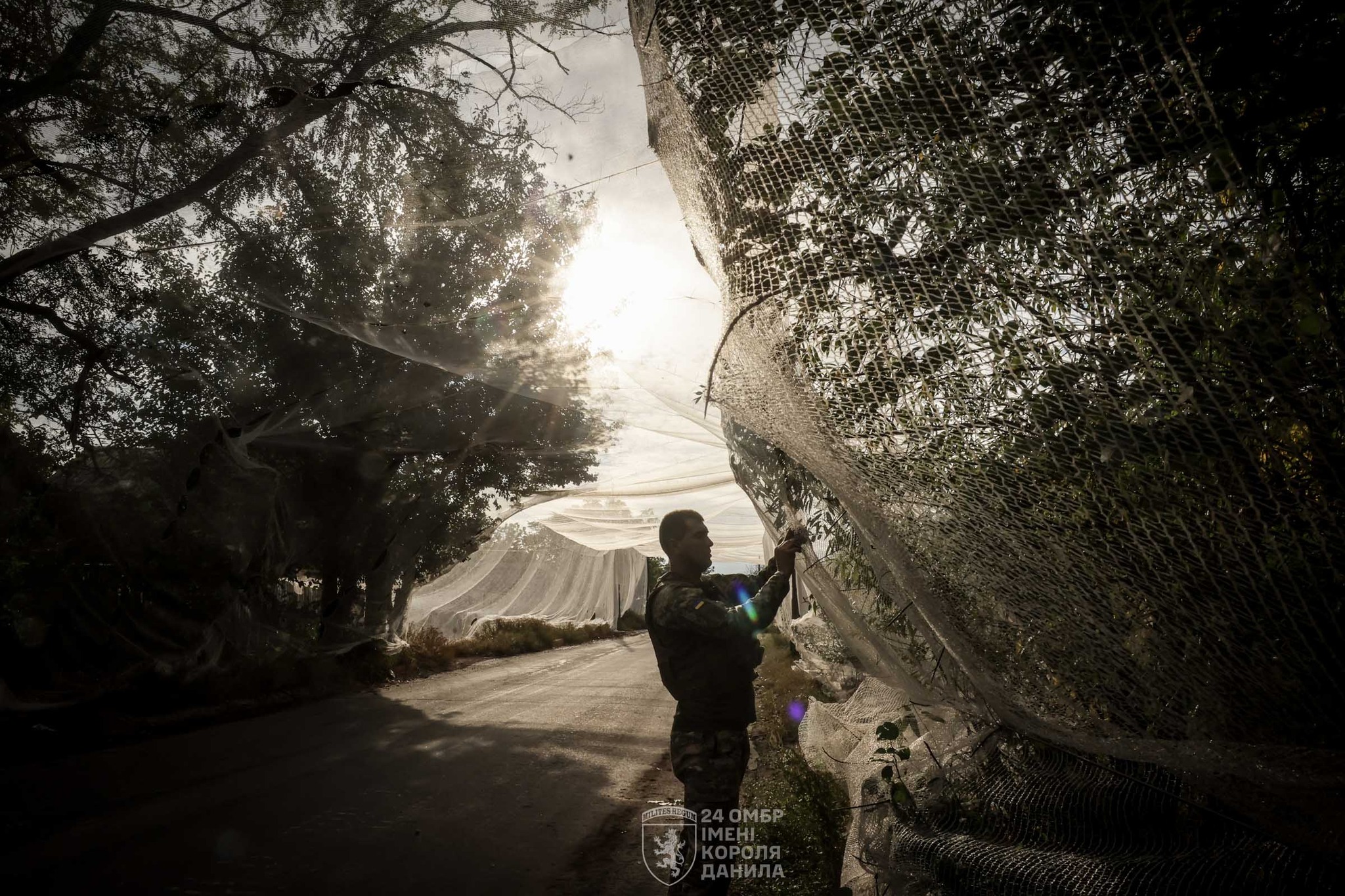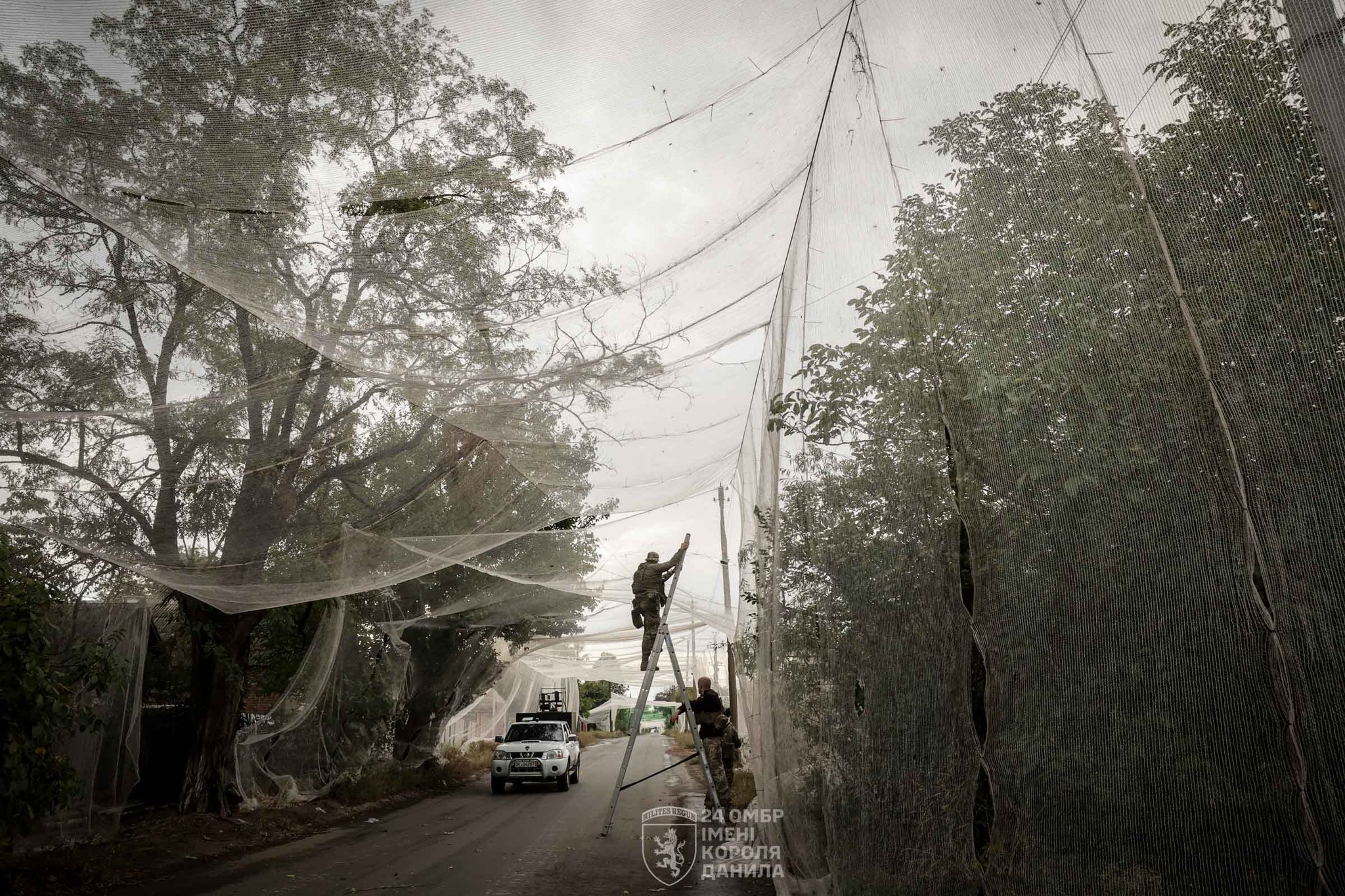 «Сітки — це вживане агроволокно, як жартують самі бійці, „з бельгійських грядок“», — розповіли у бригаді.