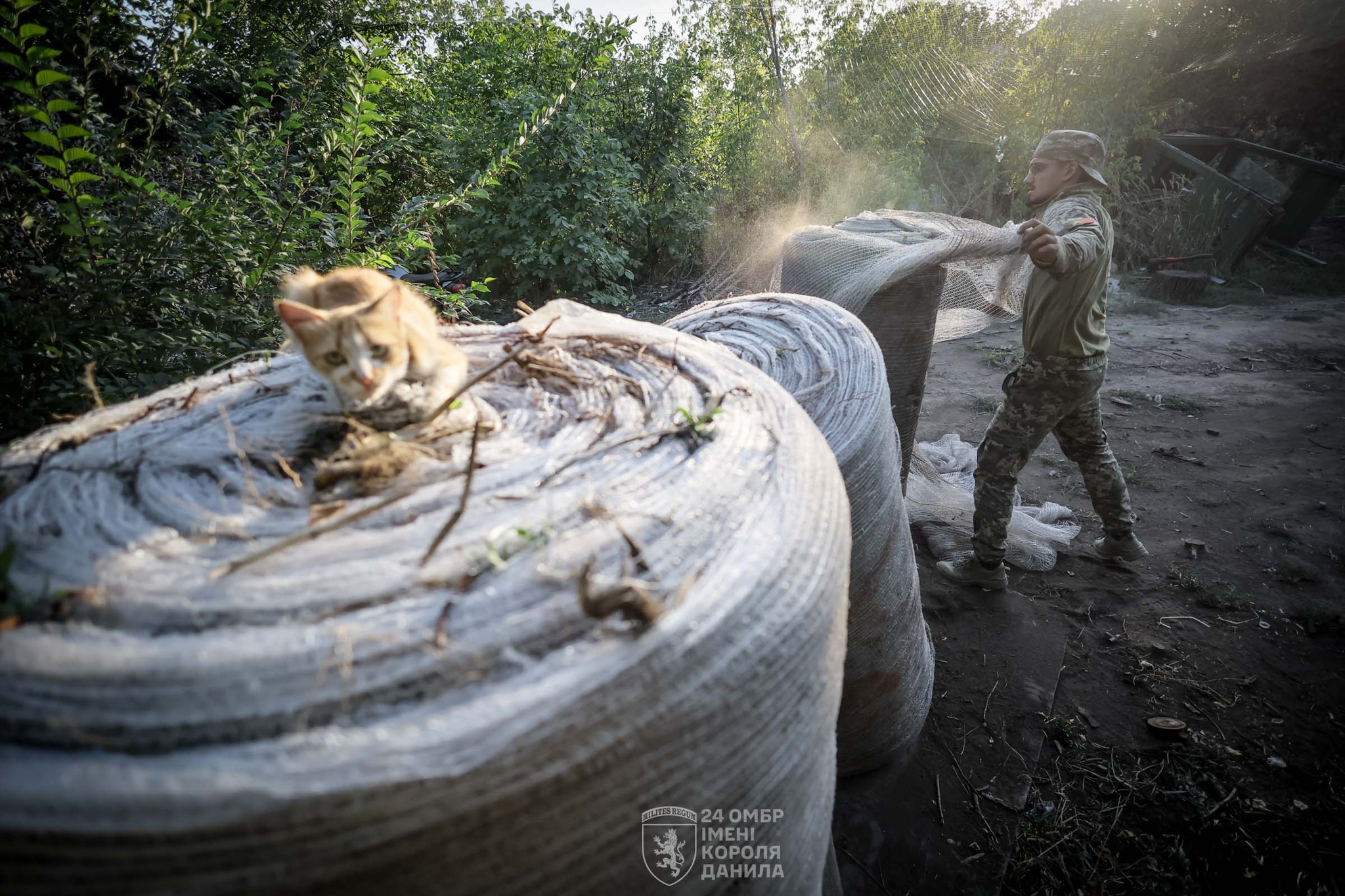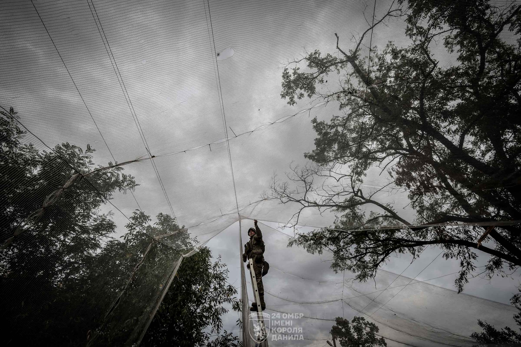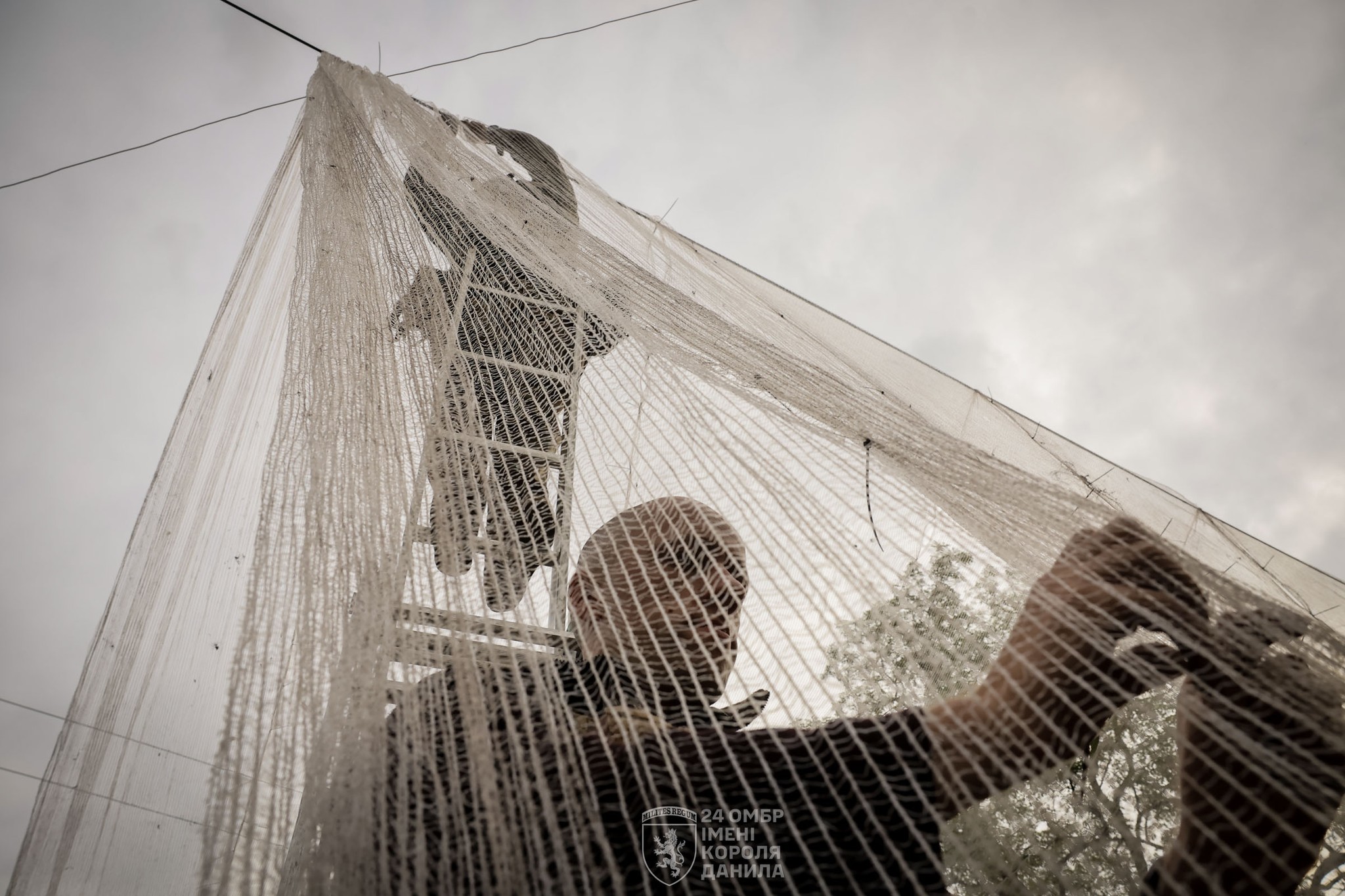 «Сітки — це вживане агроволокно, як жартують самі бійці, „з бельгійських грядок“», — розповіли у бригаді.