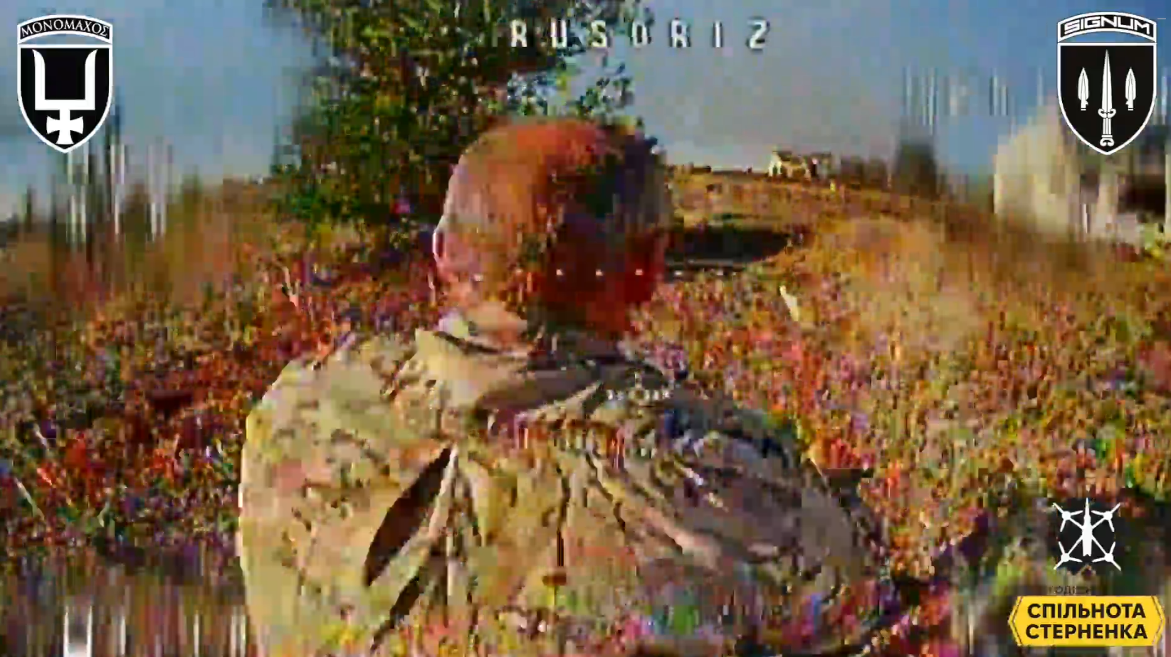 Біля розвалин знайшовся окупант, який, мабуть, не очікував гостей з неба. Зреагувати він не встиг і дрон зробив свою роботу.
