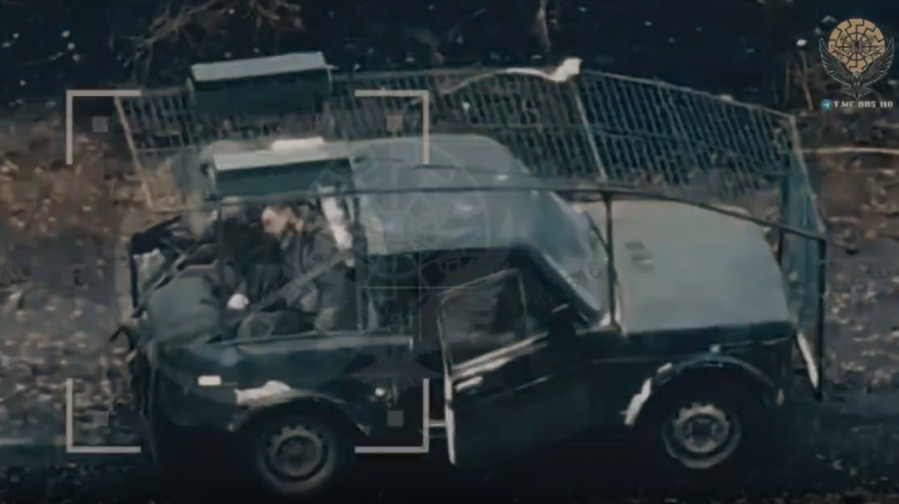 На відео видно, як оператори зафіксували рух броньованої «Ниви», обвішаної засобами радіоелектронної боротьби (РЕБ) і захисними антидроновими сітками.