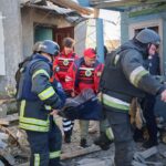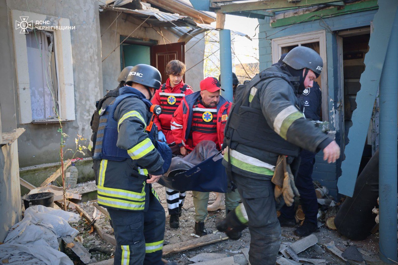 У Чернігові внаслідок атаки пошкоджені 4 житлові будинки, одна людина дістала травми. Рятувальники разом з медиками доставили постраждалого до «швидкої».