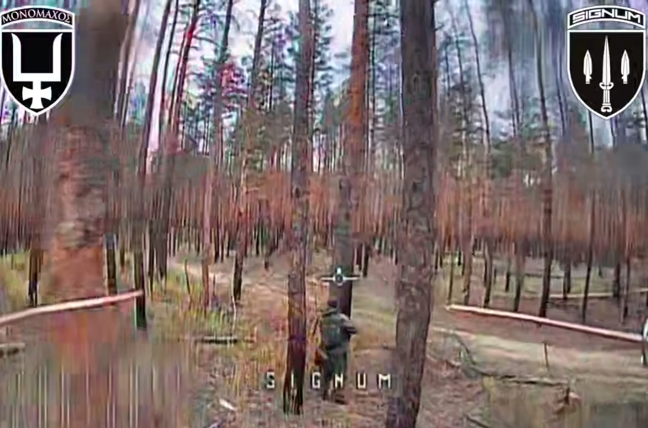 На Лиманському напрямку один окупант потрапив у поле зору одразу двох українських екіпажів БПЛА — тому момент ураження FPV-дроном батальйону «Signum» випадково зняв безпілотник суміжного підрозділу.