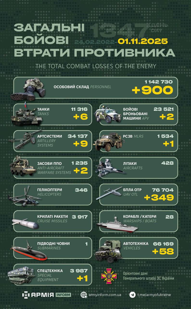 Загальні бойові втрати противника з 24.02.22 по 01.11.25 орієнтовно становлять: